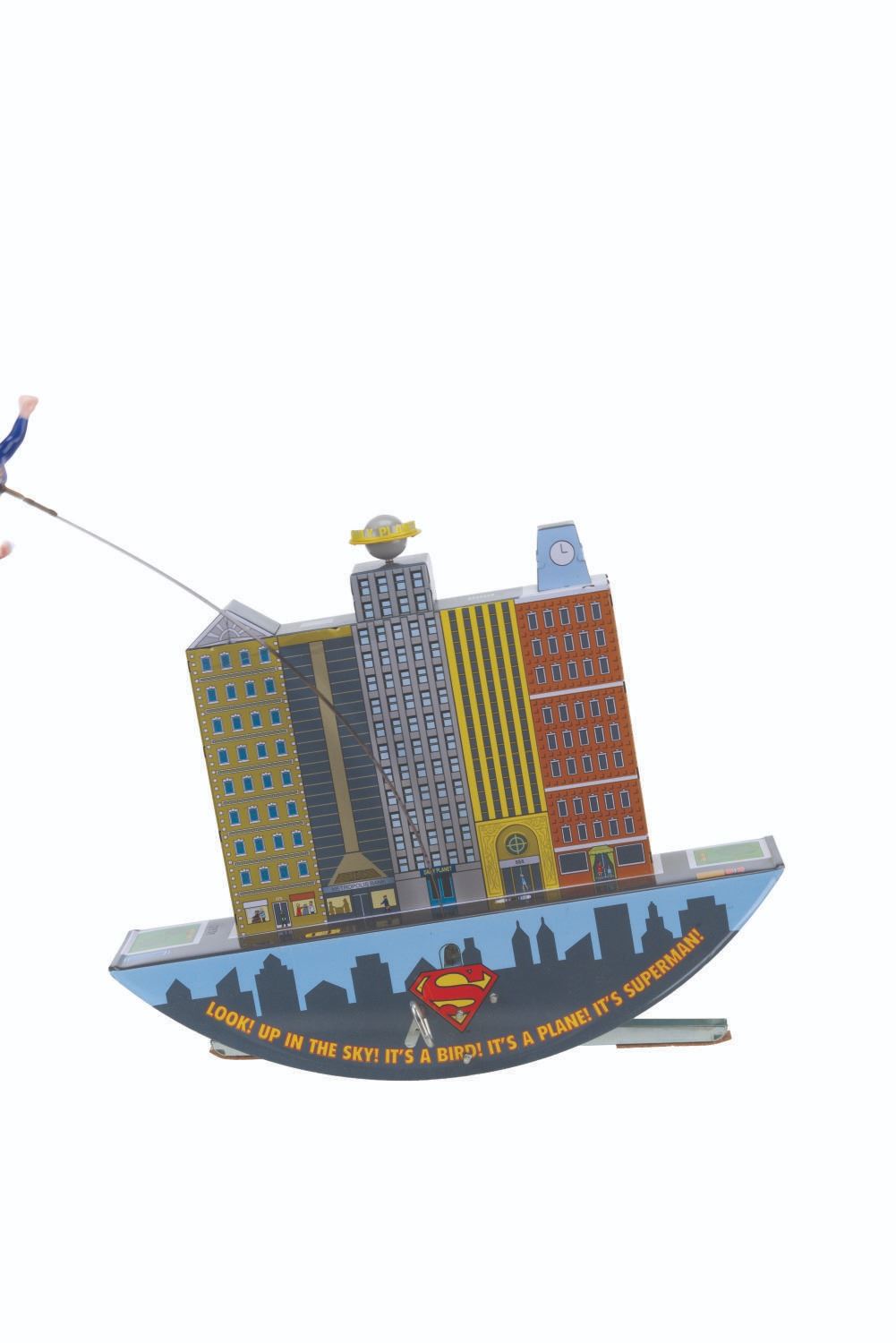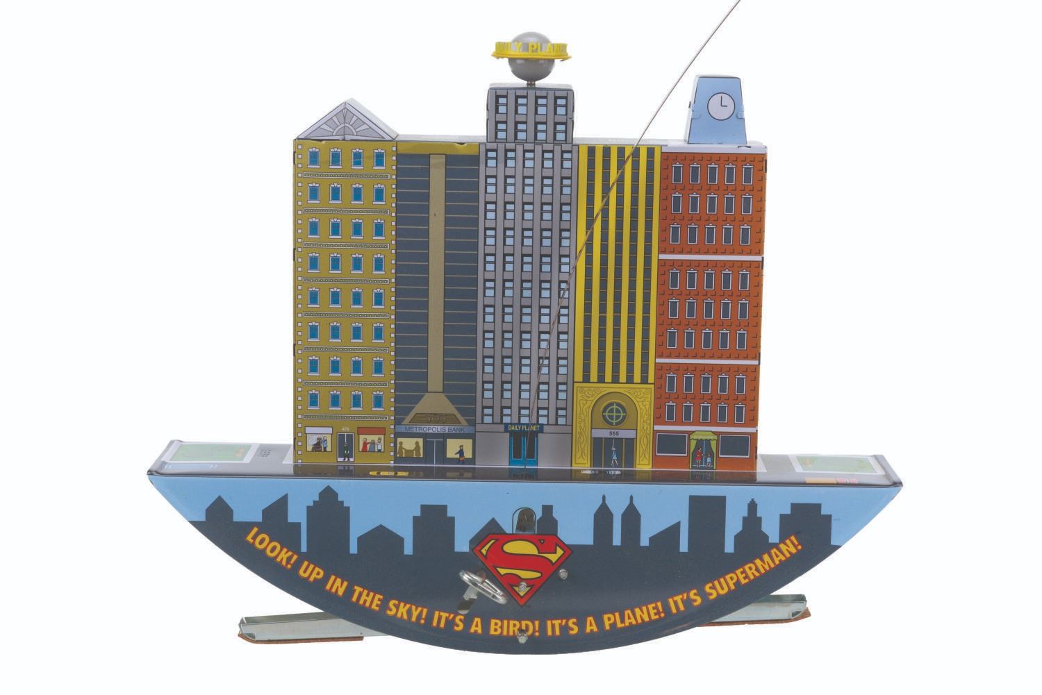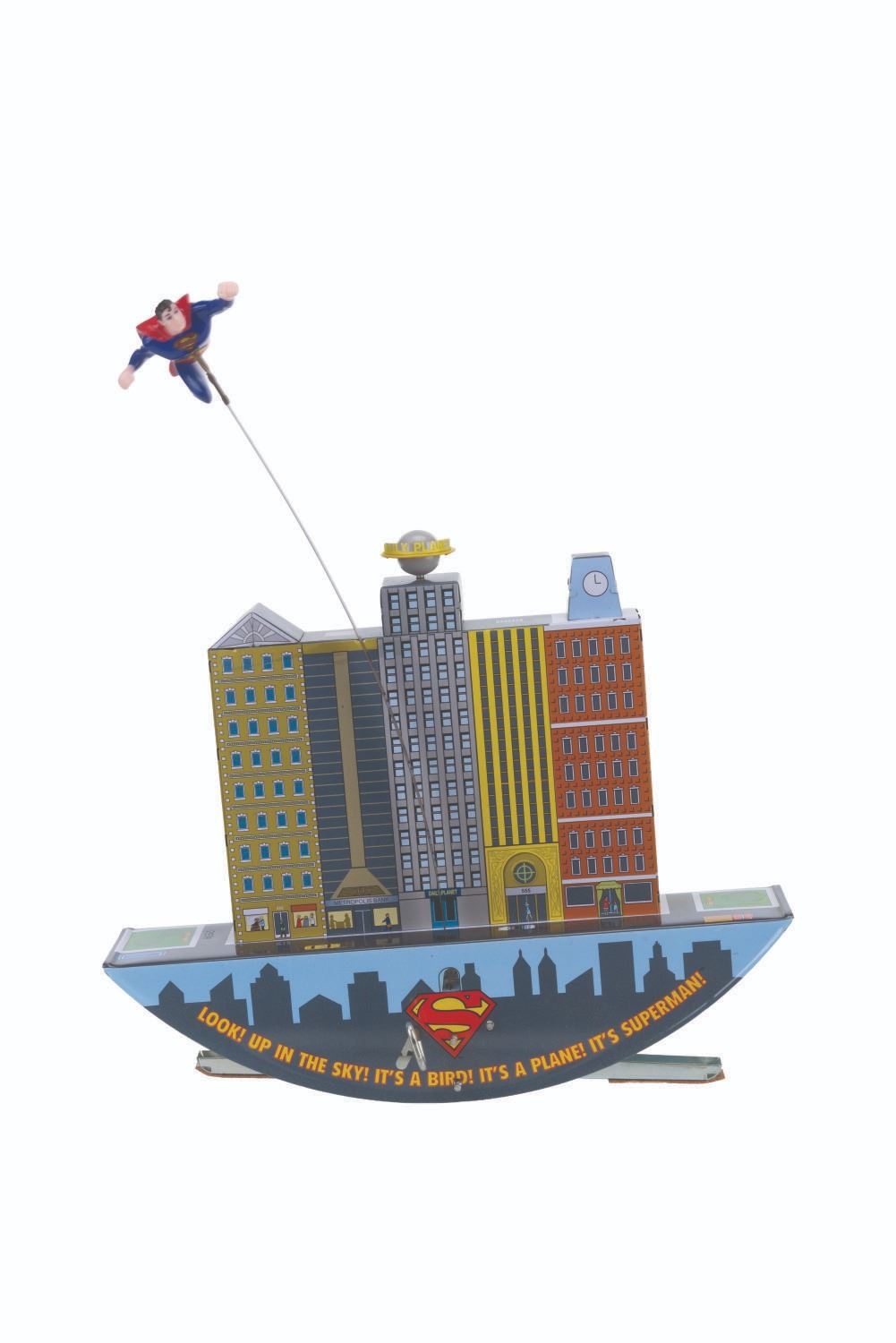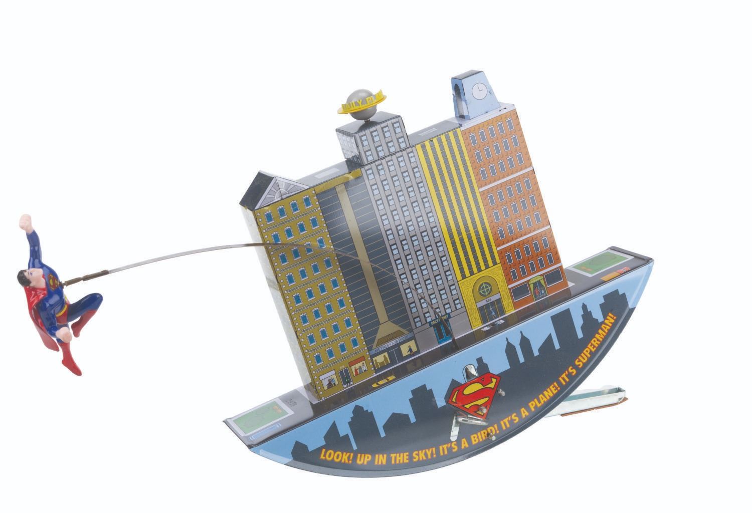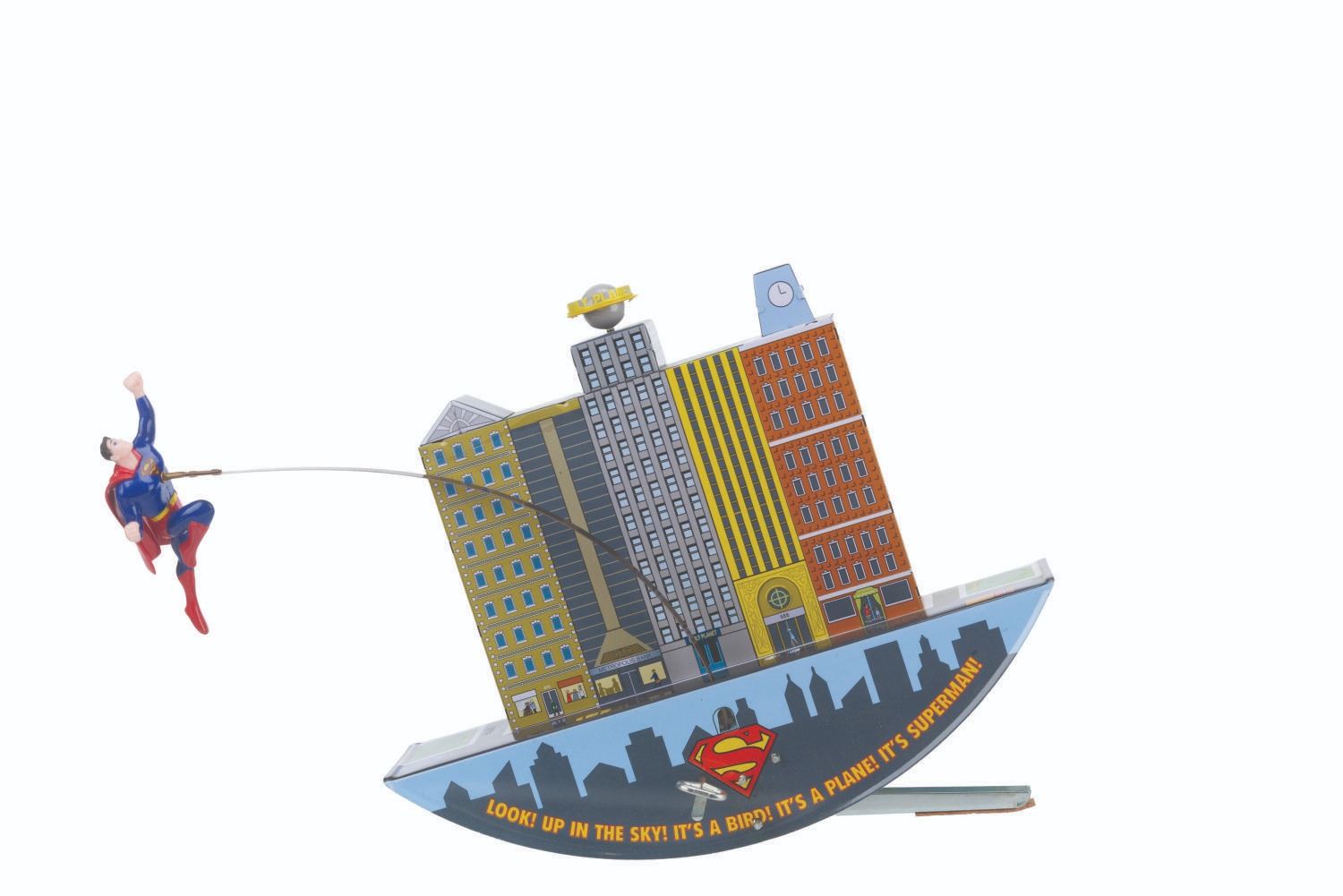 (Schylling, 2003) A delightful Superman Leaps Tall Buildings wind-up tin toy. When wound, Metropolis rocks left and right, while Superman leaps back and forth over the Daily Planet and the rest of the skyline. The 11" x 4" x 13" tall toy is in very good working condition, with very slight wear from age to Superman’s support only.