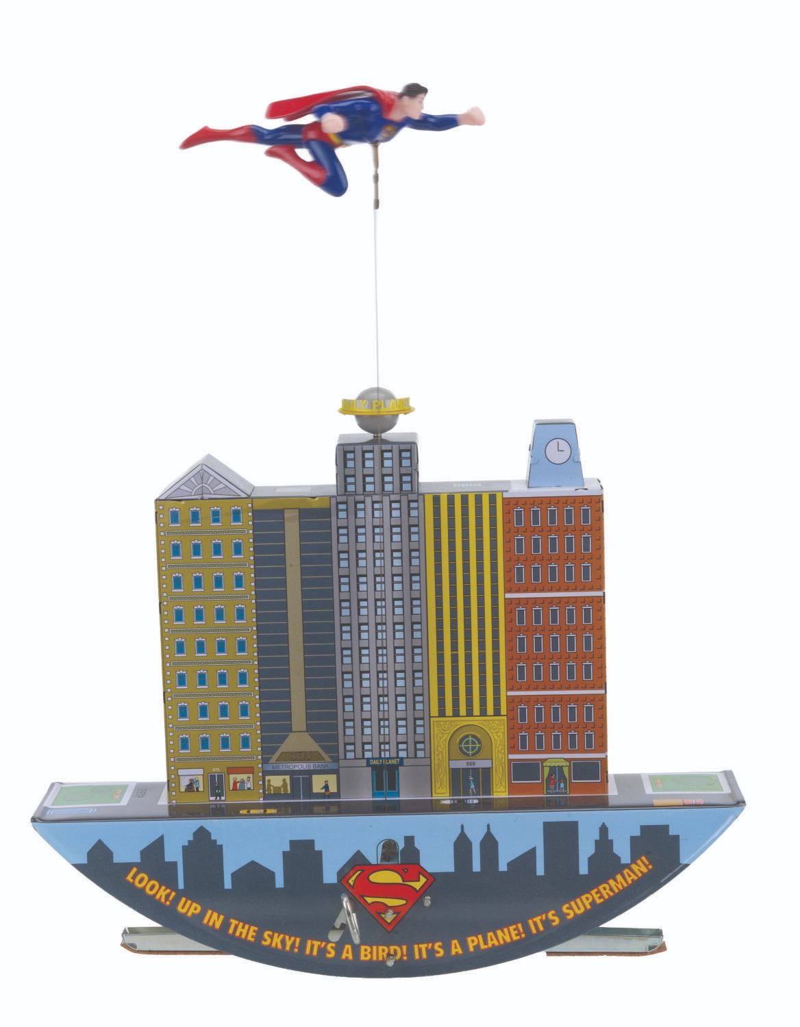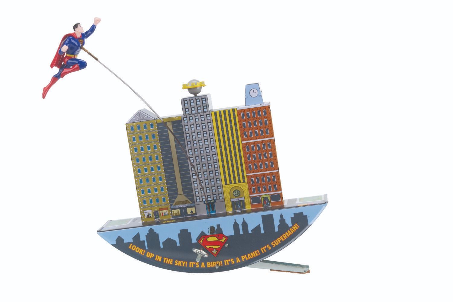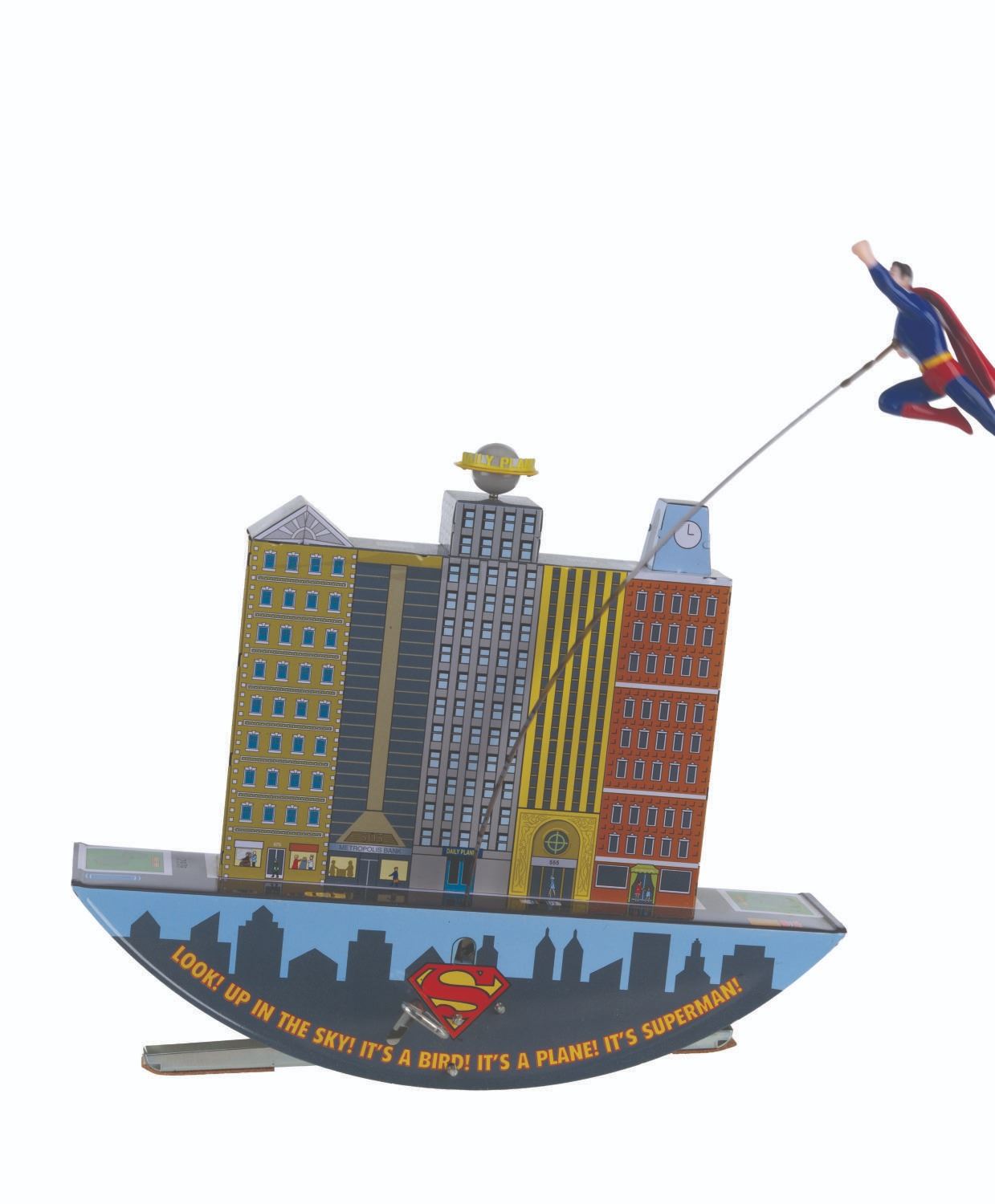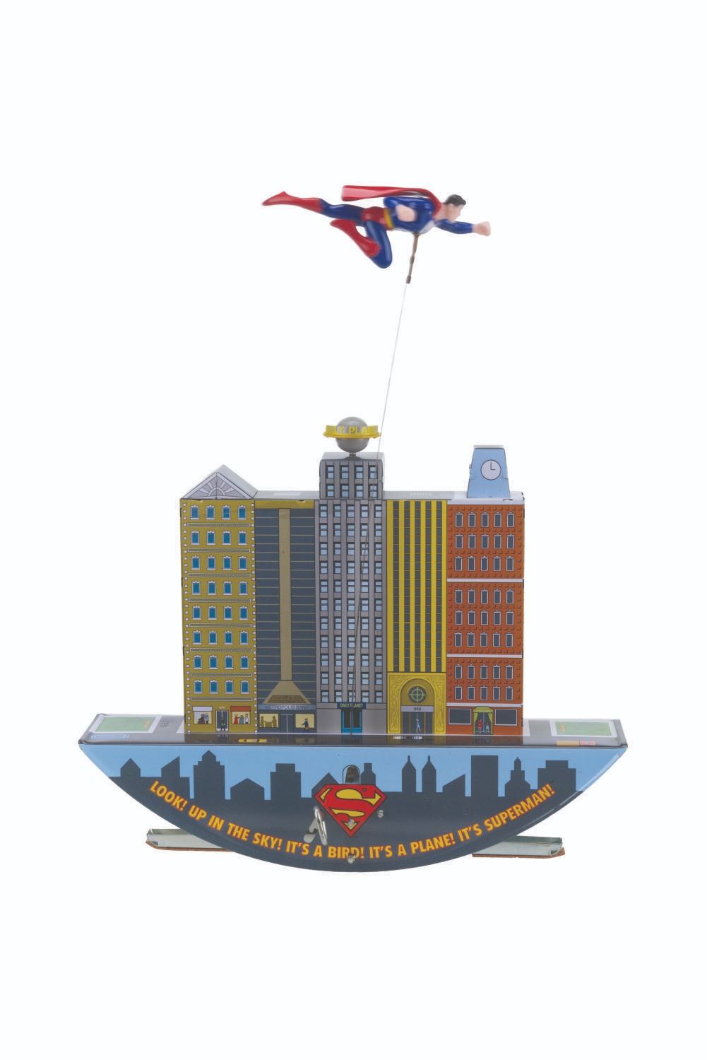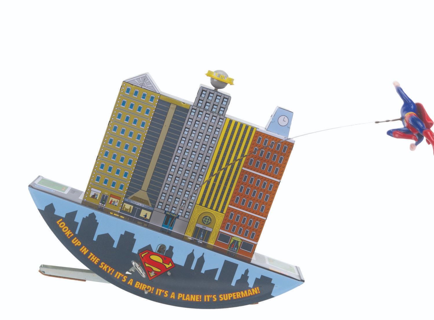 (Schylling, 2003) A delightful Superman Leaps Tall Buildings wind-up tin toy. When wound, Metropolis rocks left and right, while Superman leaps back and forth over the Daily Planet and the rest of the skyline. The 11" x 4" x 13" tall toy is in very good working condition, with very slight wear from age to Superman’s support only.