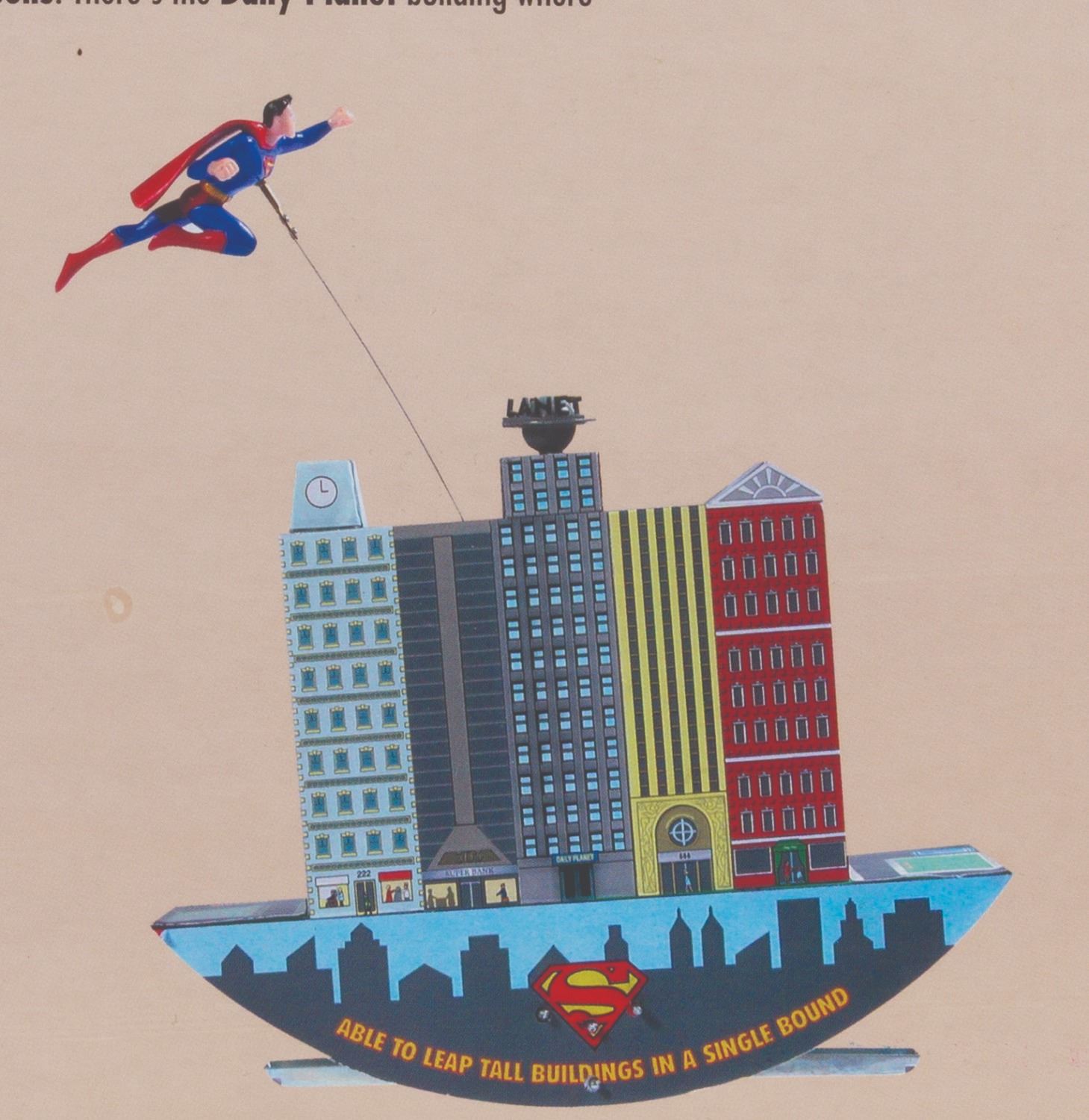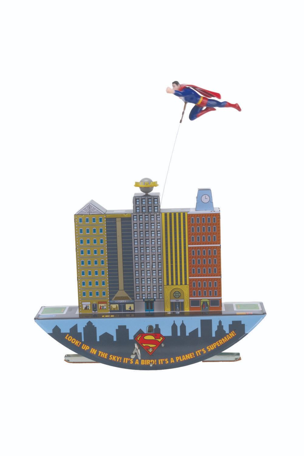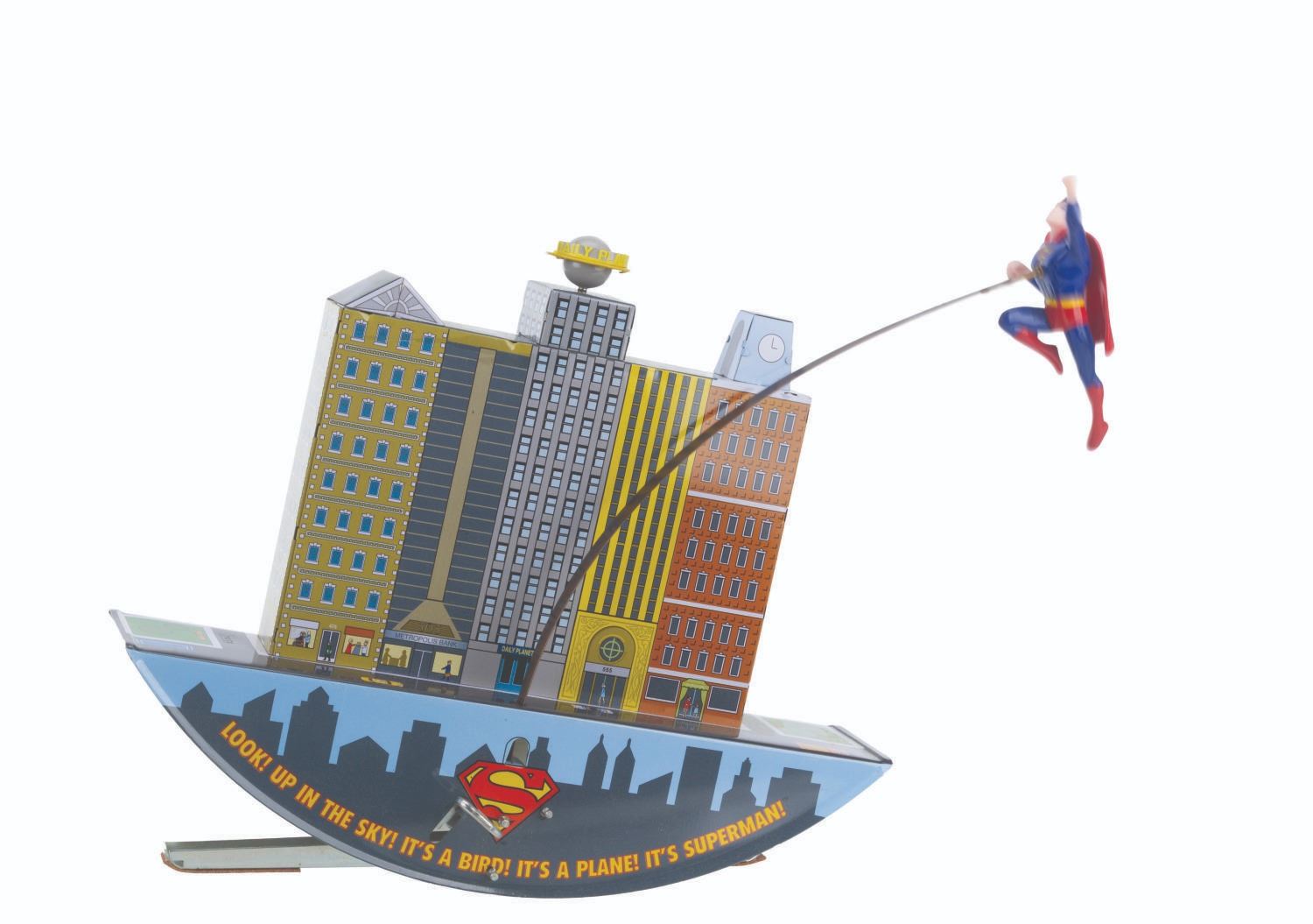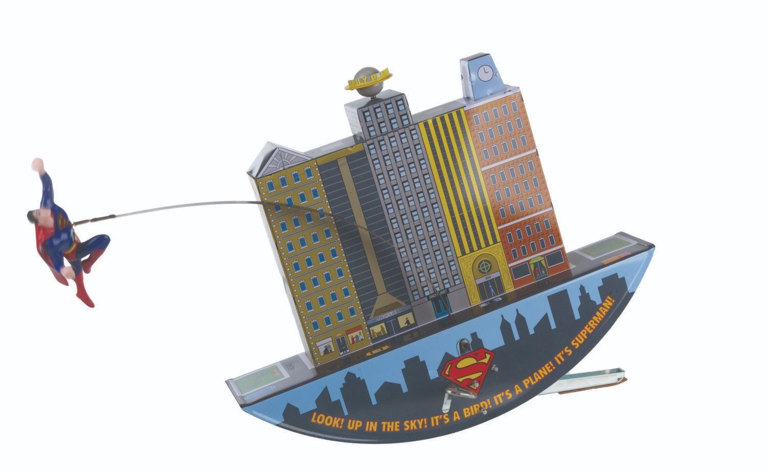 (Schylling, 2003) A delightful Superman Leaps Tall Buildings wind-up tin toy. When wound, Metropolis rocks left and right, while Superman leaps back and forth over the Daily Planet and the rest of the skyline. The 11" x 4" x 13" tall toy is in very good working condition, with very slight wear from age to Superman’s support only.