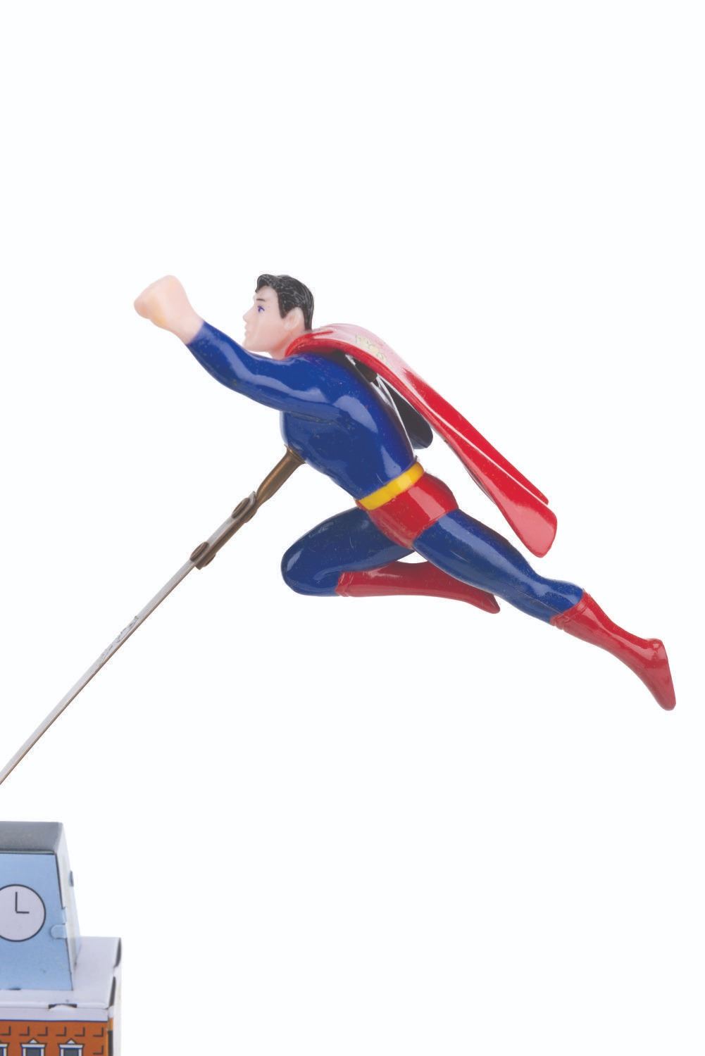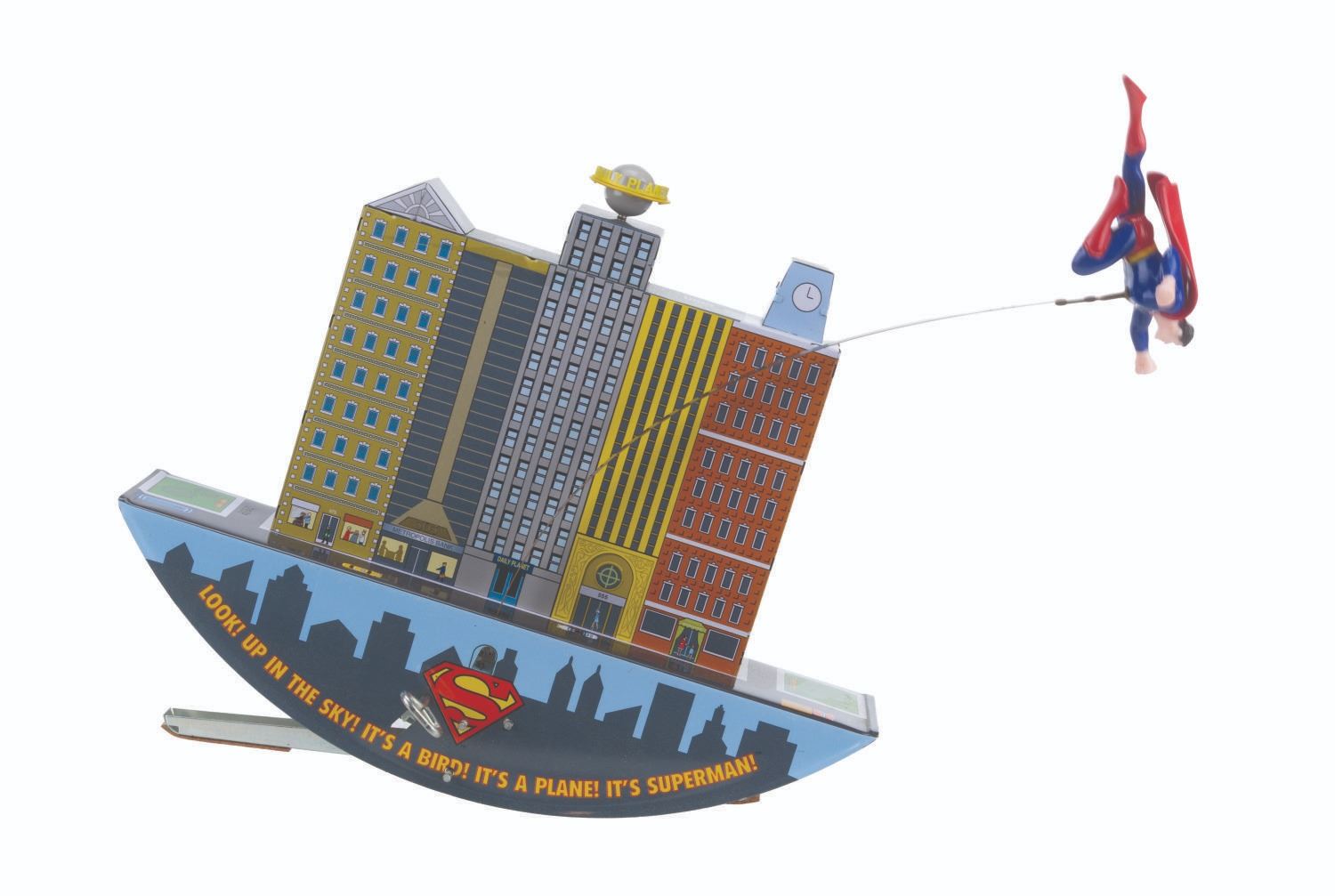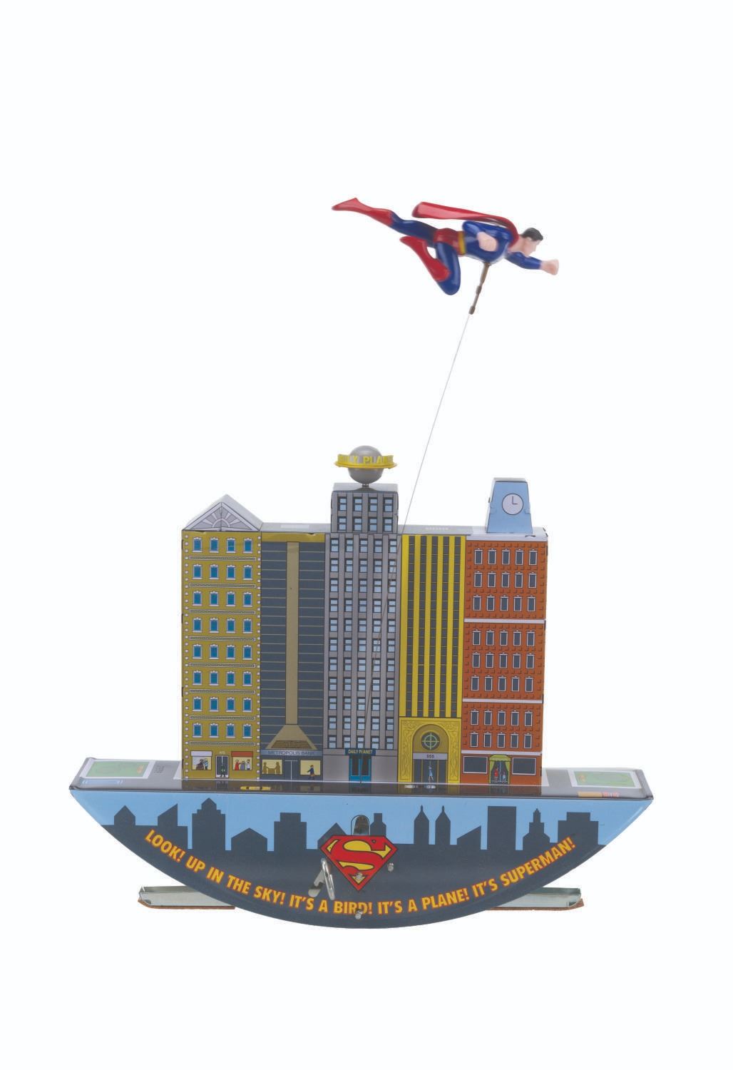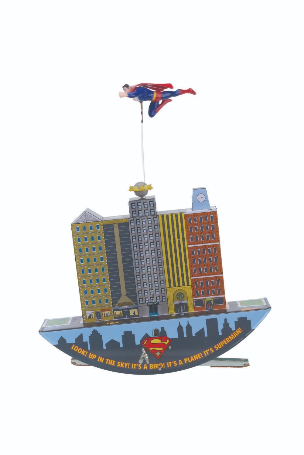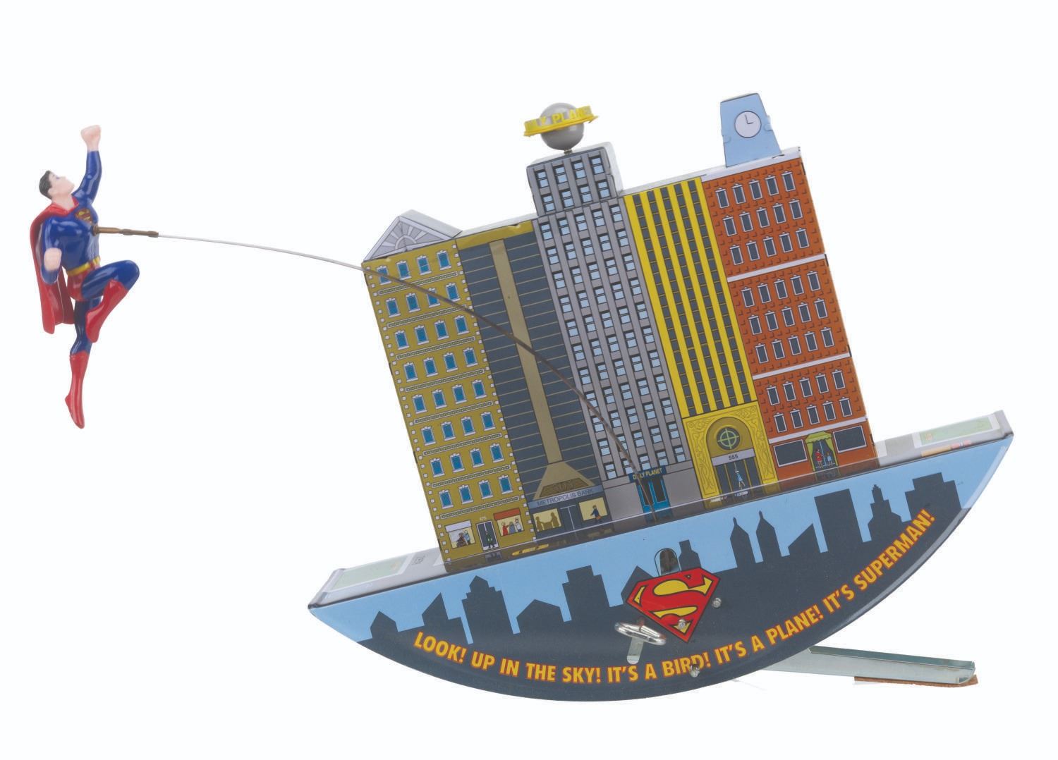 (Schylling, 2003) A delightful Superman Leaps Tall Buildings wind-up tin toy. When wound, Metropolis rocks left and right, while Superman leaps back and forth over the Daily Planet and the rest of the skyline. The 11" x 4" x 13" tall toy is in very good working condition, with very slight wear from age to Superman’s support only.