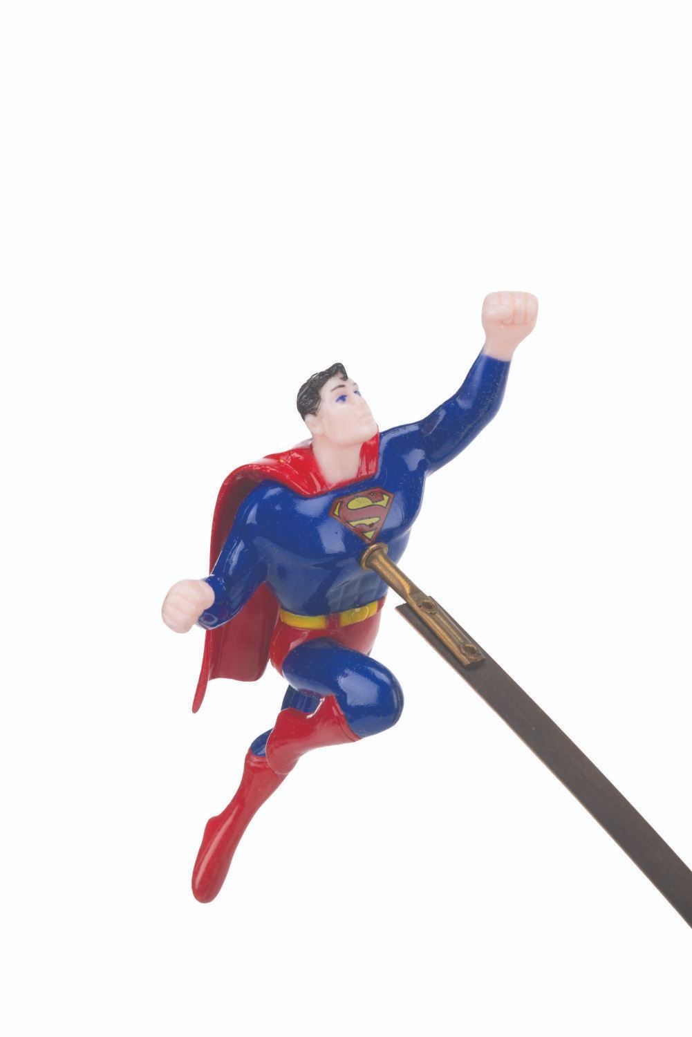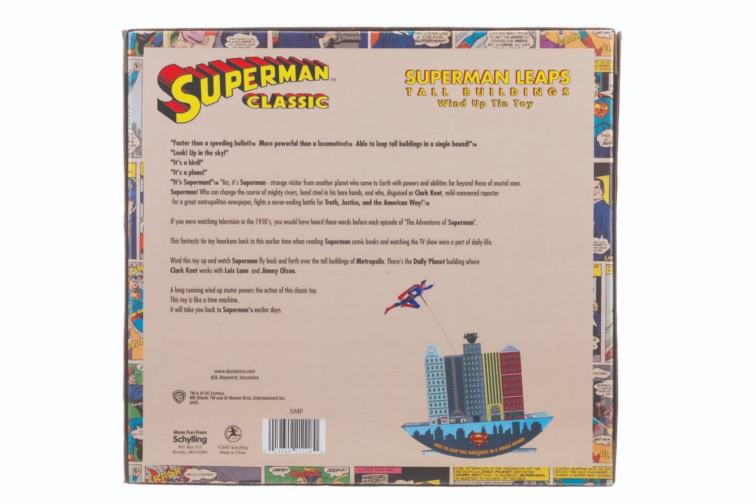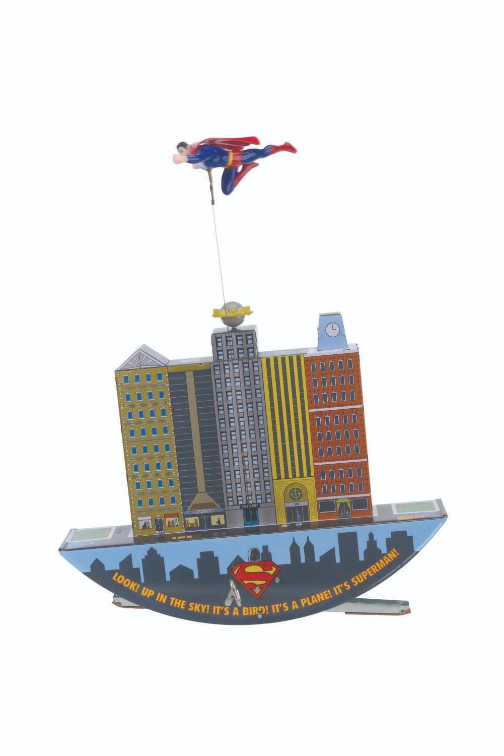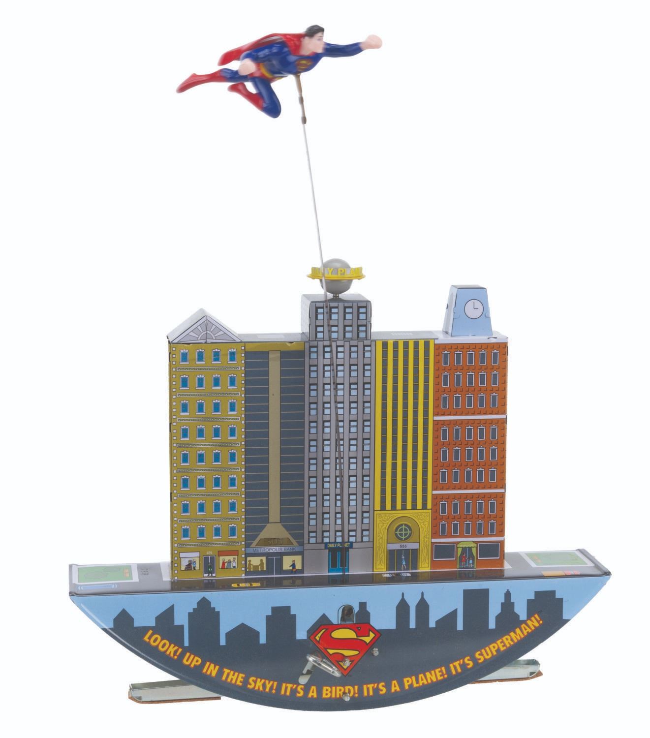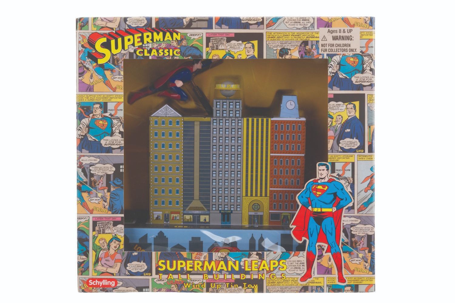 (Schylling, 2003) A delightful Superman Leaps Tall Buildings wind-up tin toy. When wound, Metropolis rocks left and right, while Superman leaps back and forth over the Daily Planet and the rest of the skyline. The 11" x 4" x 13" tall toy is in very good working condition, with very slight wear from age to Superman’s support only.