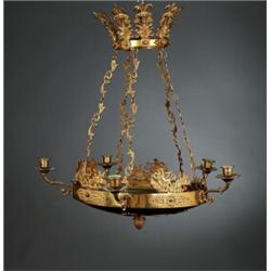 A Swedish early 19th century gilt and patinated bronze five-light LANTERN, Karl Johan, some brass decorations, 68 cm high, 67 cm diameter; insignificant damages