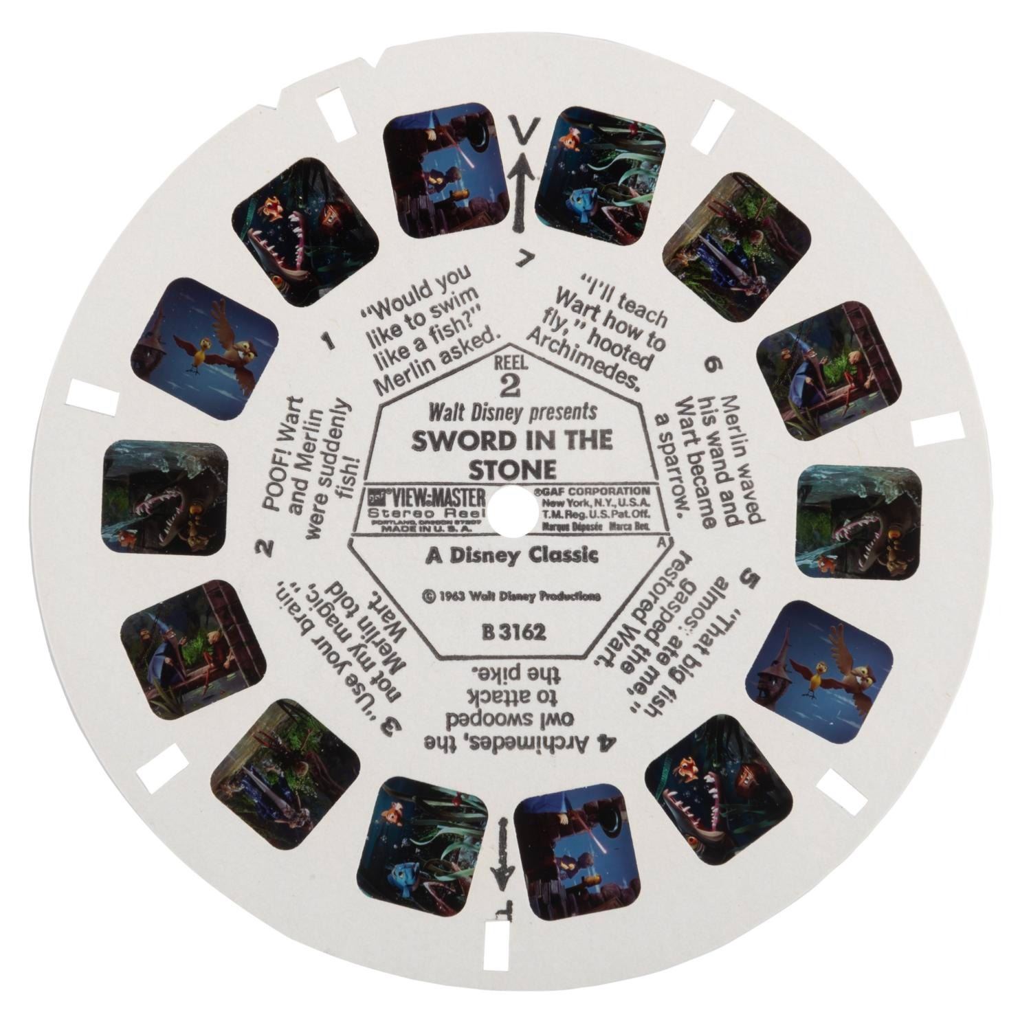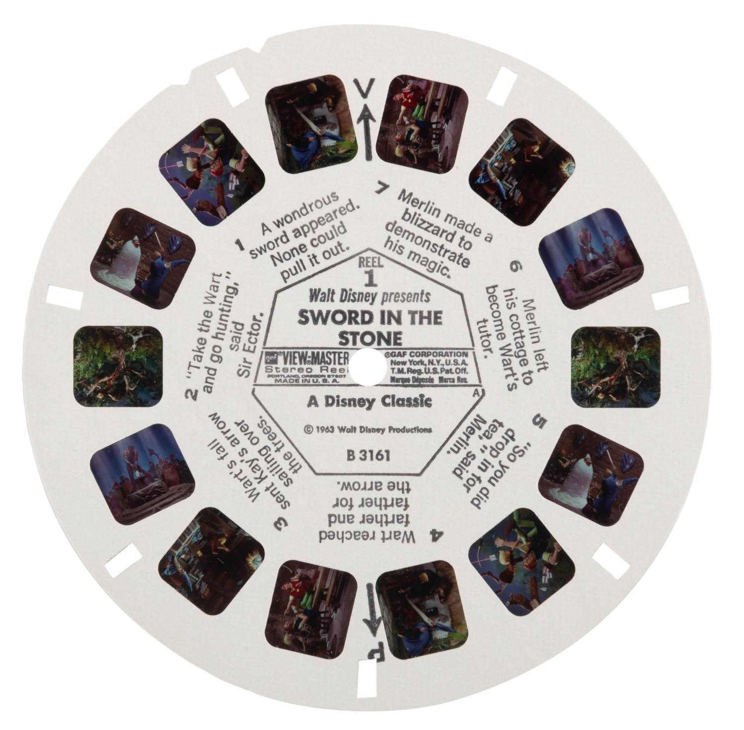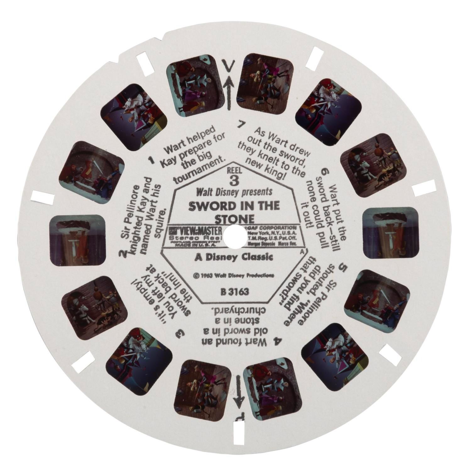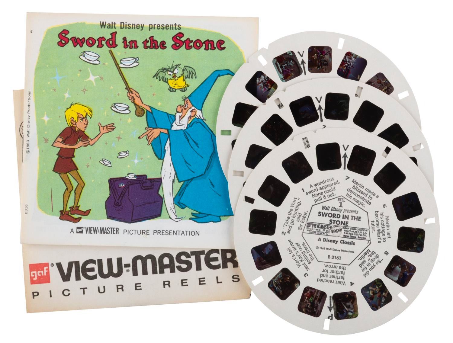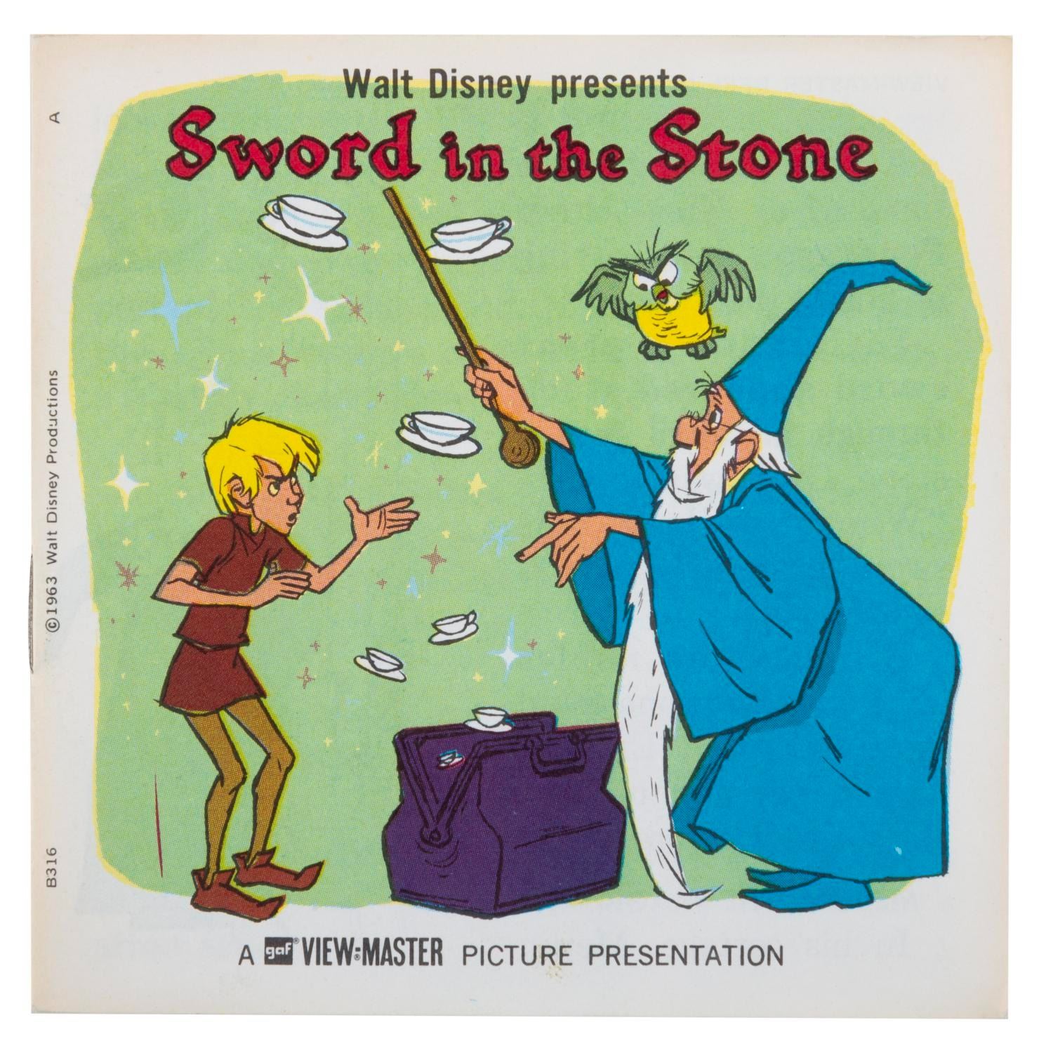 (GAF, 1963) A"Sword in the Stone" View-Master set featuring beautiful models of the characters and sets seen in the film. The set is in very good condition including all three reels and the storybook, but missing the envelope.