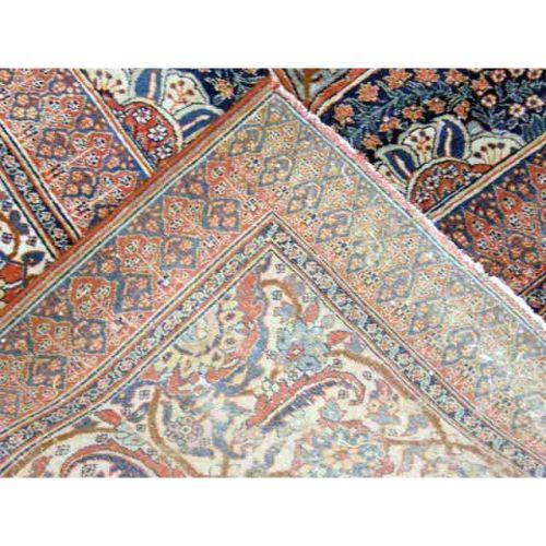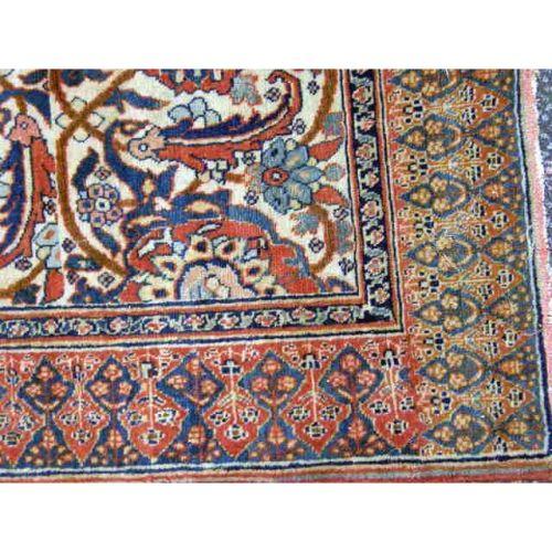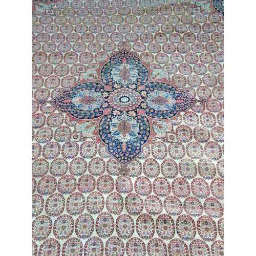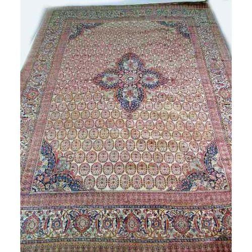 A TABRIZ CARPET<BR><BR>The ivory field with a central lobed blue medallion surrounded by closely spaced floral devices and with blue spandrels, the whole enclosed by a main ivory palmette and vine border and subsidiary red trefoil borders, approximately 12`8"l x 9`3"w. Provenance: Sotheby`s Sale 5529, lot 205