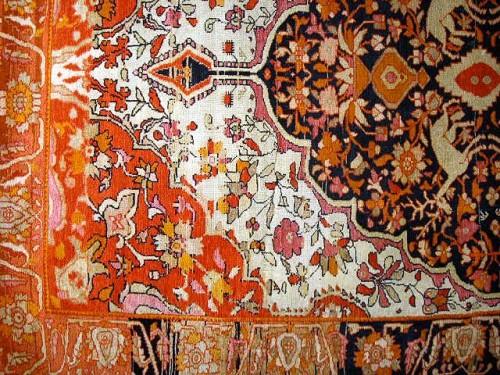 A TABRIZ STYLE RUG; Mounted as a wall hanging, Ivory and orange ground, 76" x 48" worn