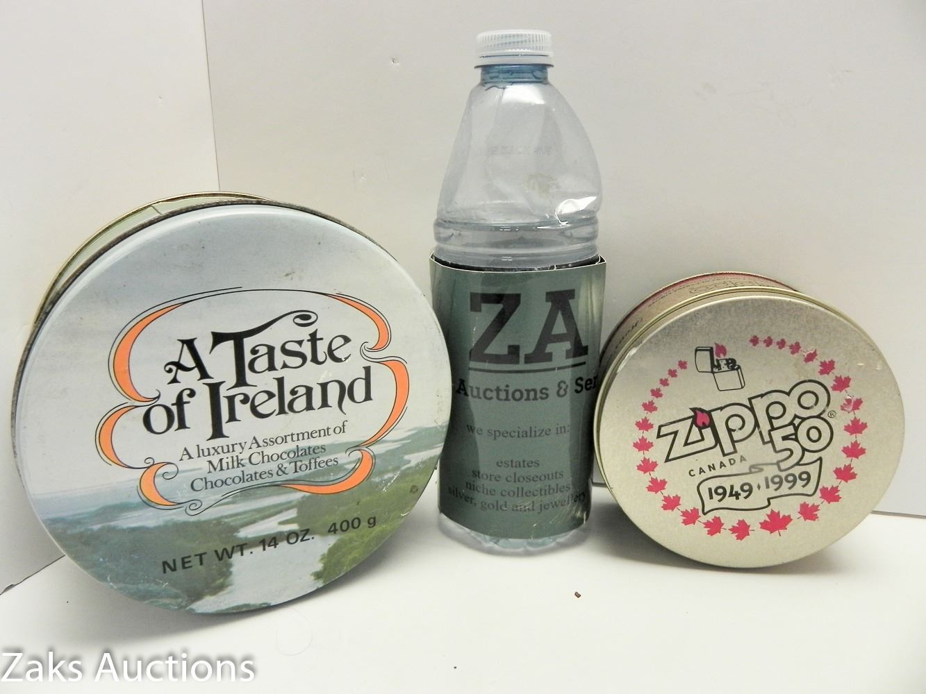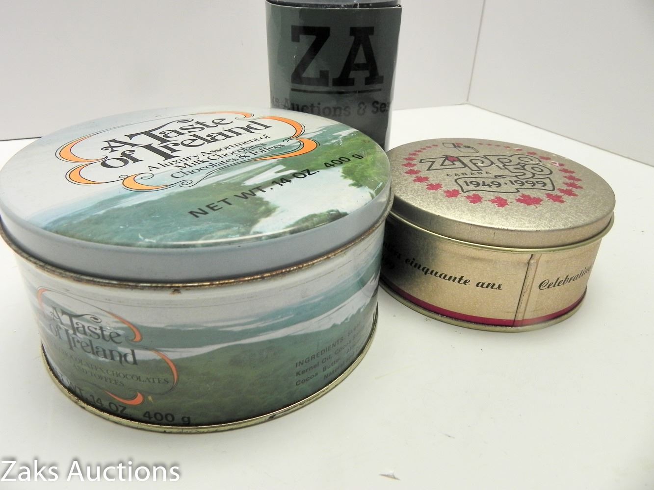 A TASTE OF IRELAND CHOCOLATES AND ZIPPO 50TH ANNIVERSARY TINS. ALL TINS ARE EMPTY