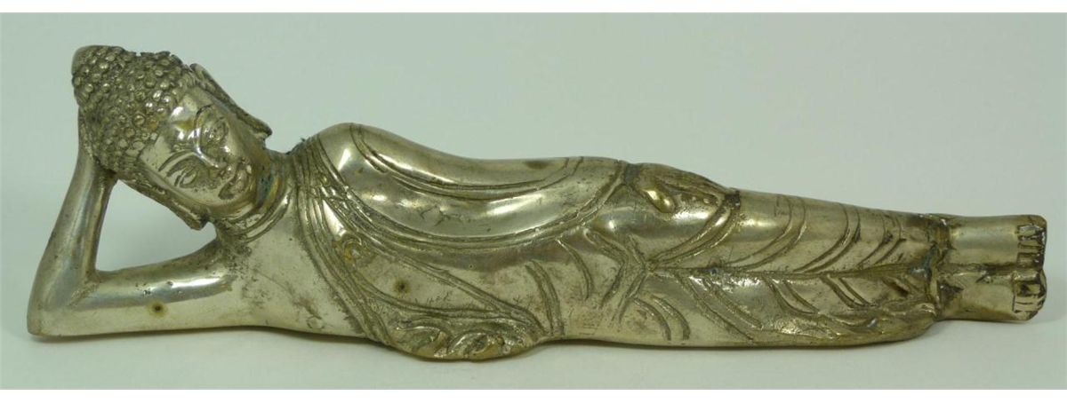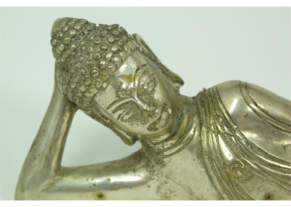 A Thai silver plated figure depicting Reclining Buddha. Measures 3" height x 9 5/8" length (7.6cm x 22.8cm). Total weight of 659 grams.