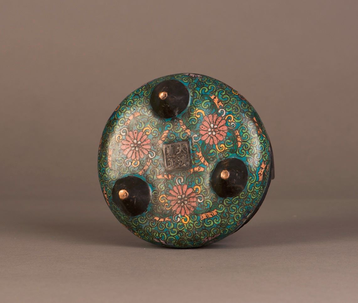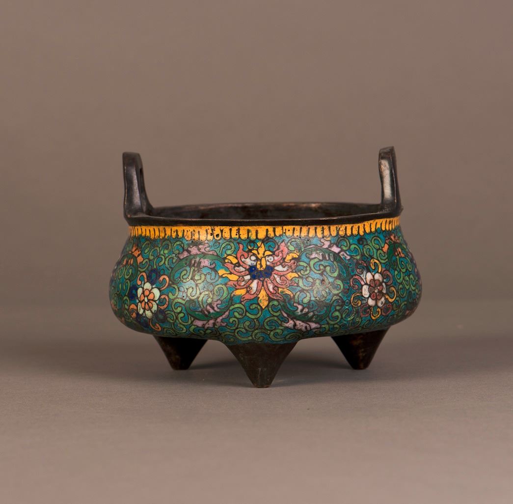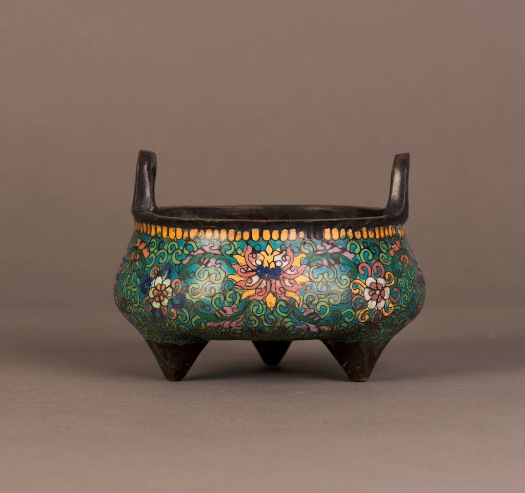 A three-footed cloisonne censer featuring densely enamelled floral and foliate patterns on the body, two loop handles stand on top of the rim, bearing an incised four-character seal on the base. Diameter 5.5“