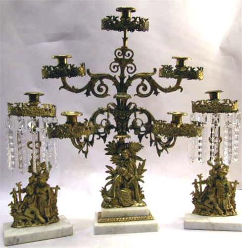 A THREE PIECE MARBLE AND GILT DECORTED GARNITURE SET;