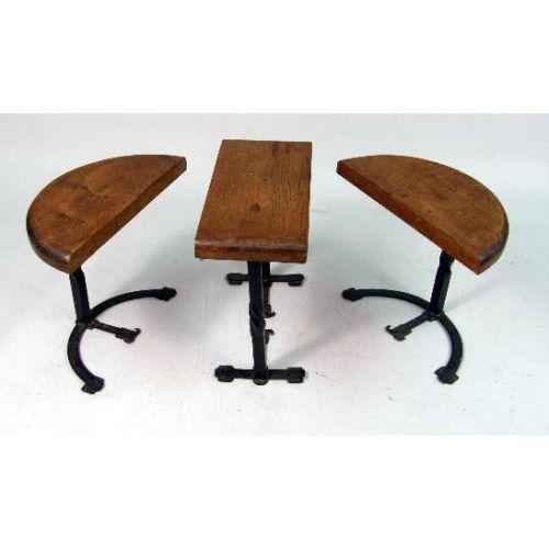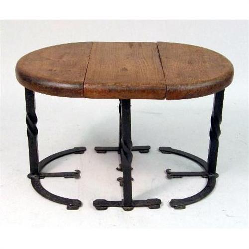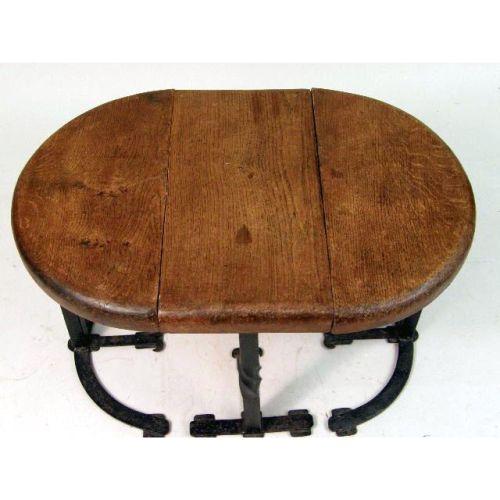 A THREE PIECE OAK AND WROUGHT-IRON TABLE<BR><BR>Table can be divided into three for seating, 18"h x 29"w x 19-1/2"d