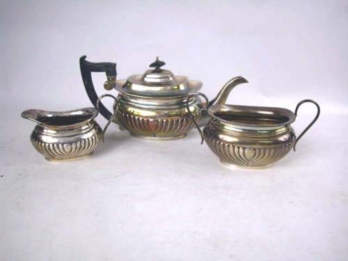 A THREE PIECE SHEFFIELD SILVER TEA SET; Maker E.V. teapot, 6"h, two-handled sugar, creamer, gadrooned bulbous body Apx. 39 T.O