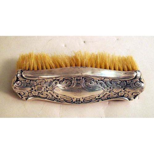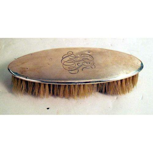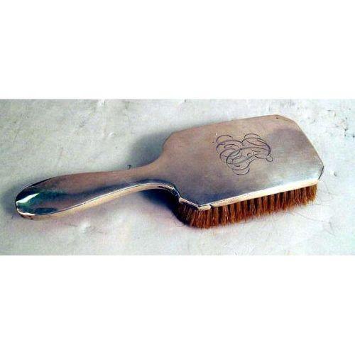 A THREE-PIECE STERLING SILVER HANDLED DRESSER SET<BR><BR>Together with another brush, hand mirror, 8-3/4"l