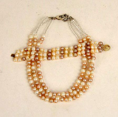 A THREE STRAND WHITE, PINK AND MAUVE PEARL NECKLACE