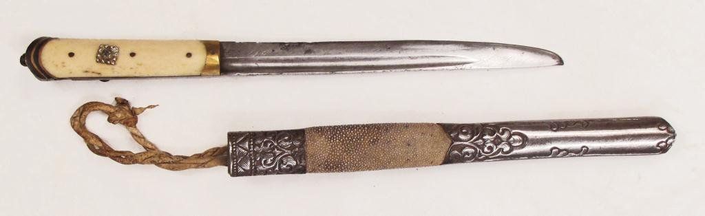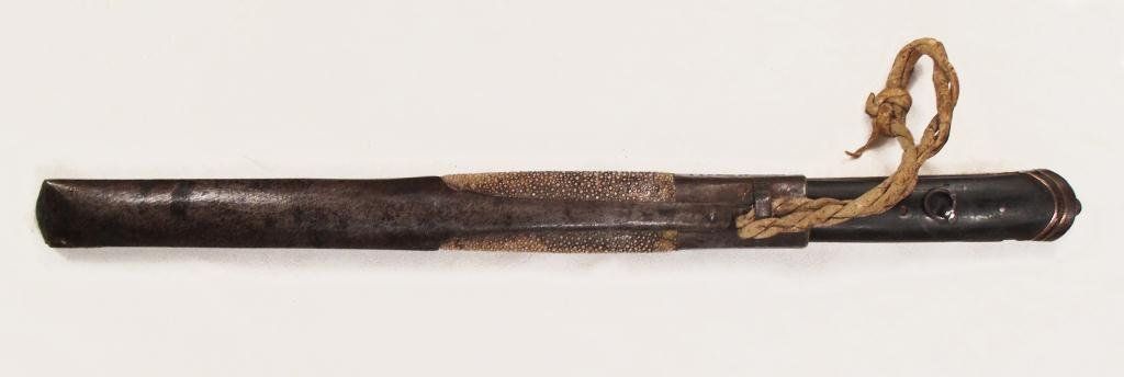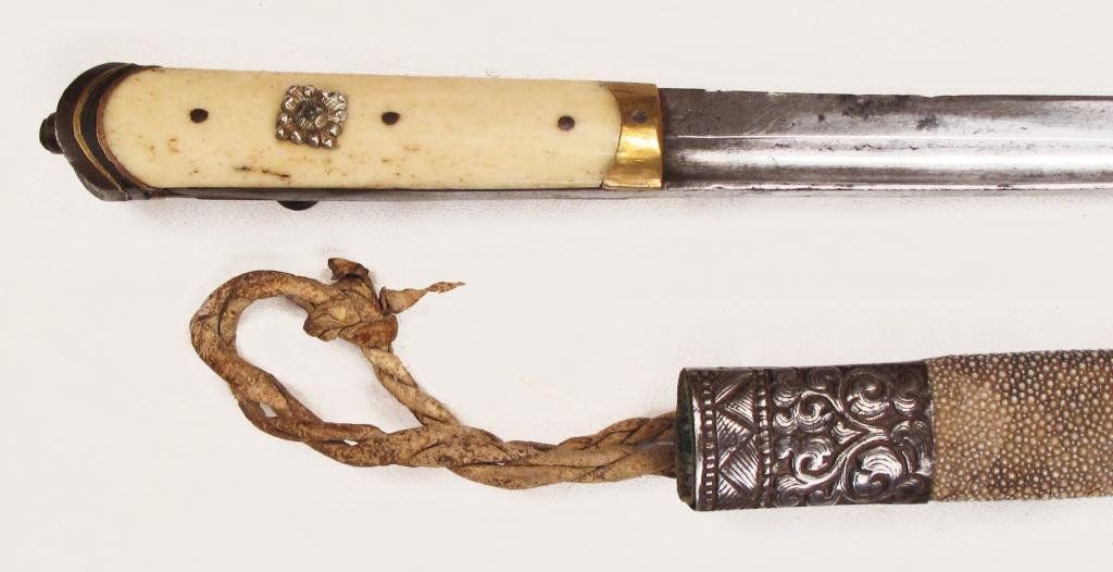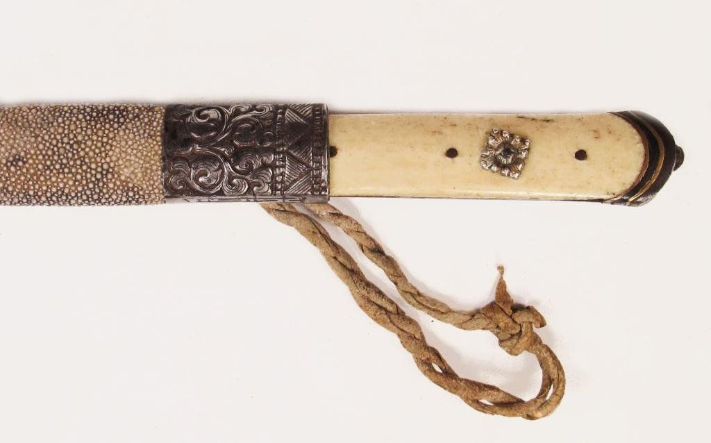 The grips of antler with an engraved silver boss and brass pommel and bolsters, the straight, single-edged blade deeply fullered. In its rayskin covered scabbard with finely embossed iron mounts and hide suspension band. Late 19th ' early 20th century.Overall length 37.5 cm. Condition I