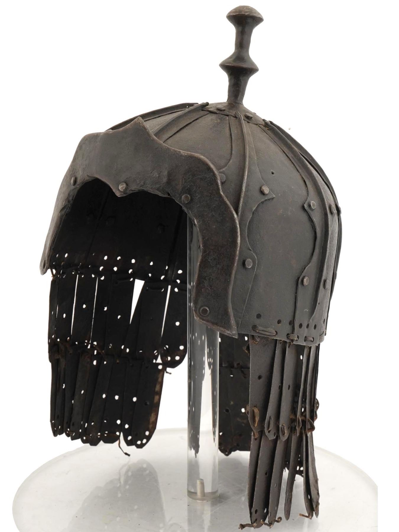 A fine example of a military helmet made of iron shells and plates. The helmet consists of a hemispherical skull made from multiple panels riveted together, a short brim at the front, and a finial knob surmounting the top. Supporting plates riveted over the seams and exterior create a pleasing design and reinforce the helmet. Attached to the rim are segmented lamellae plates connected by cords of leather through piercings to cover the ears and the back of the neck. This helmet originated in Tibet but was also popular in China, Mongolia, Korea, and Japan.