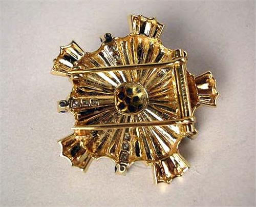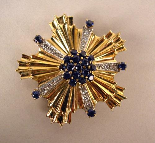 A TIFFANY & CO 14K YELLOW GOLD, DIAMOND, AND SAPPHIRE BROOCH With fifteen full cut diamonds, total estimated weight apx. 0.50 carat, clarity VVS2, color E-F, and twenty natural sapphires, total estimated weight apx. 2.25 carats