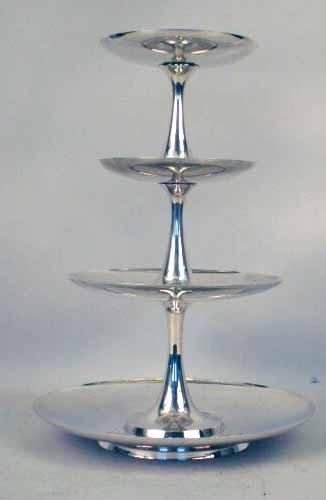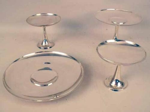 #23665 JL, KL, & LL, in four pieces, comprising a circular ring footed tray, 10"dia., and three graduated pedestal compotes. One rim with slight dent. Total height 14"h, total weight approximately 45 T.O.