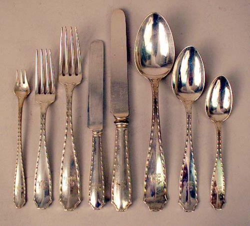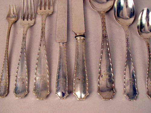 Monogrammed "BA", comprising twelve each dinner knives and forks, luncheon knives and forks, soup spoons, teaspoons, dessert spoons and knives, and cocktail forks. Weight approximately 150 T.O. weighable. 96 pieces.