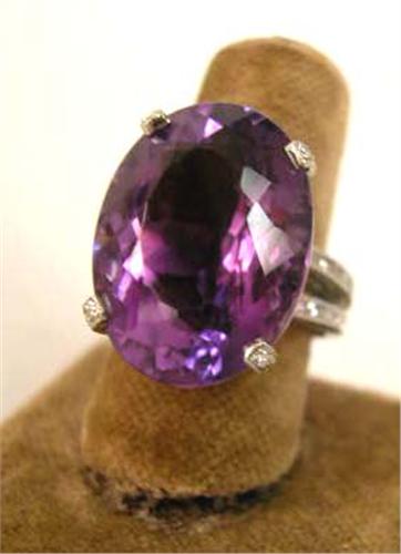 A TIFFANY & CO. PLATINUM, AMETHYST AND DIAMOND RING; Center oval amethyst, est. weight 22.76 ct., set with four prongs, 2 round brilliant diamonds are bead set into each prong, 32 single cut diamonds are bead set into split style shank, 33 single cut Diamonds are the lower pavilion, 10 single cut Diamonds are bead set between the upper & lower pavilions, 20 squ. diamonds are channel set, & 4 round brilliant dia, in up. pav.