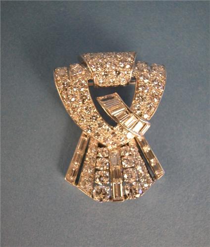 A TIFFANY & CO. PLATINUM AND DIAMOND ART DECO SINGLE CLIP BROOCH; With 64 Old European cut Diamonds are bead set, 8 Old European cut Diamonds are set with 4 prongs each, estimated weight 5.22 ct, 16 straight baguette Diamonds are channel set, estimated weight, 1.15 ct, 1-3/8" x 1-1/8"