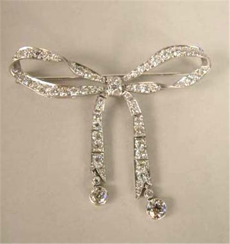 A TIFFANY & CO. PLATINUM AND DIAMOND RIBBON AND BOW BROOCH; Two Old European cut Diamonds, estimated weight 1.05 ct., are bezel set at the ends of each ribbon, 63 Old European cut Diamonds, estimated weight 3.75 ct are bead set in the bow