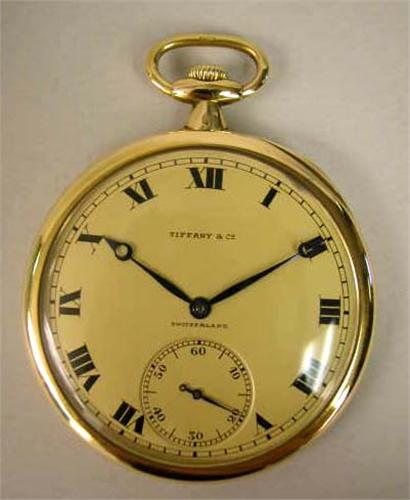 A TIFFANY & CO. YELLOW GOLD PATEK PHILIPPE POCKET WATCH; Yellow enamel face marked "Tiffany & Co. Switzerland", with Roman Numerals, three letter scroll monogram on reverse, 1-7/8"dia.