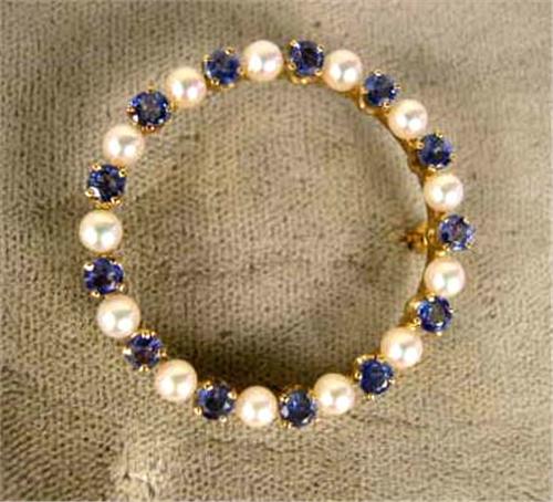 A TIFFANY & CO YELLOW GOLD PEARL AND SAPPHIRE CIRCLE PIN; 1-1/4"dia.