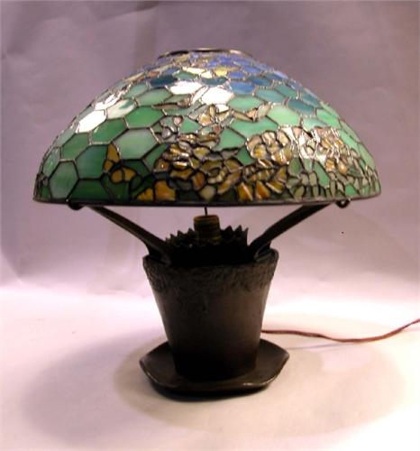 A TIFFANY STUDIOS BRONZE FLOWER POT LAMP; New York, #139, with a brown-green patina, together with a stained glass butterfly and floral motif shade, unmarked, 12"h
