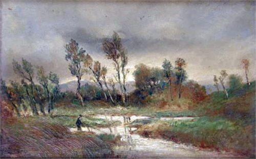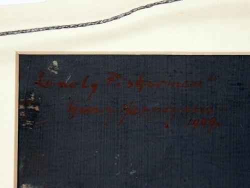 Lonely Fisherman, initialed and dated l.l.c. H.H. 1909, verso titled, signed Henry Harpignies and similarly dated. Henri-Joseph Harpignies (French, 1819-1916) began painting in 1846 at the age of twenty-seven. He was a prolific and popular painter, and made a name for himself in France. He is sometimes considered to be a member of the Barbizon School but the influence of Corot is more obvious. Sight size 5 7/8"h x 8 3/4"w