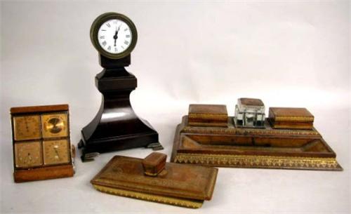 A TOOLED LEATHER DESK AND TRAVELING CLOCK; Together with a miniature tall case clock (wear)