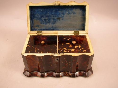 A TORTOISESHELL RECTANGULAR TEA CADDY; Fitted with two covered compartments, 10"l, losses