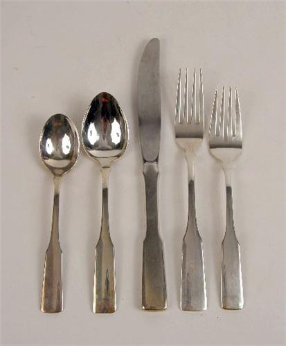 Comprising seven dinner knives and forks, seven salad forks, eight dessert spoons and eight teaspoons, some with polished finish, some matte.
