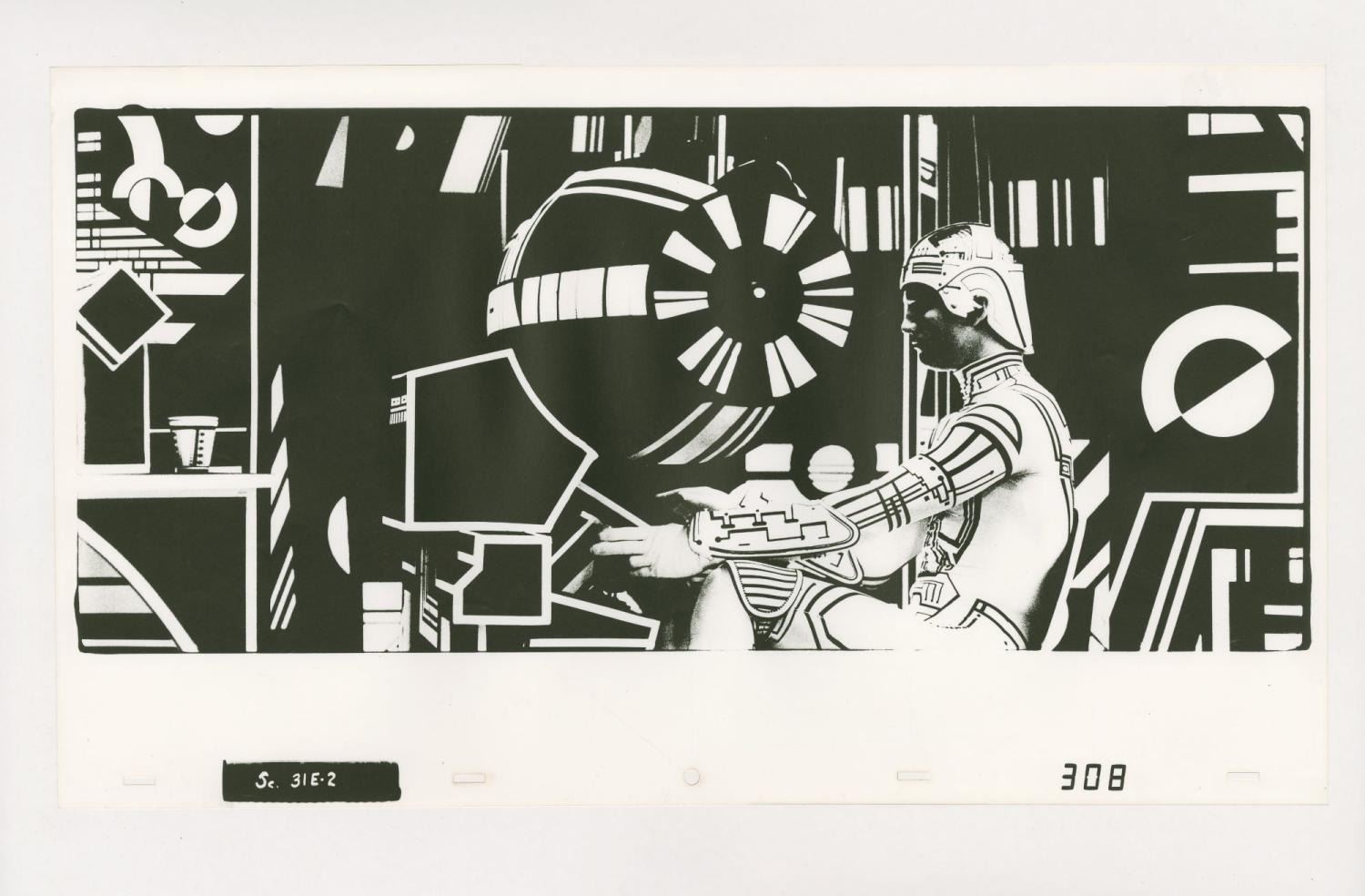 (Disney, 1982) An original photostat effect print of CLU from "TRON." The photostat on paper print was created at the studio and used during the production of the special effects sequences in the film. The groundbreaking film predated modern-day computer animation and effects, requiring the unique lighting effects to be hand-created frame by frame. This painstaking process was only used for "TRON," making the film's effects artwork a special piece of movie history. With an image size of 8.5" x 19.5" on 11.75" x 20" paper, the print is in very good condition with light creases, discoloration near the pegholes, and edge wear.