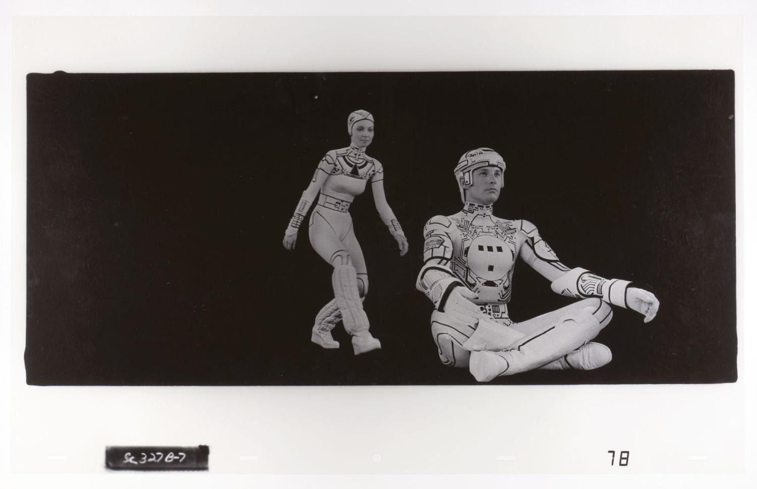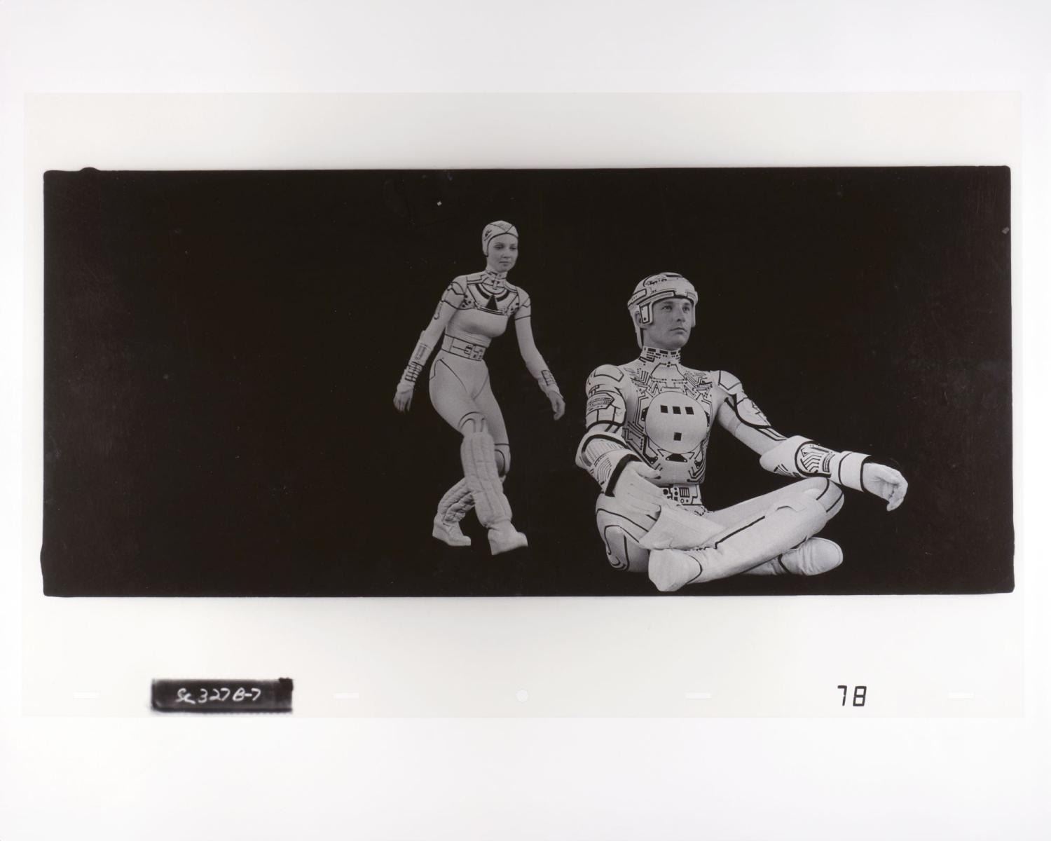 (Disney, 1982) An original Ektachrome continuous tone transparency cel of Flynn and Yori in the Master Control Program from Disney’s 1982 feature film “TRON.” Each frame of film was transferred to several transparencies so that special effects could be added. With an image size of 8.75” x 19.5” on a 12.5” x 20” cel, the transparency displays in very good condition with light scratches, creases, and wear from production use.