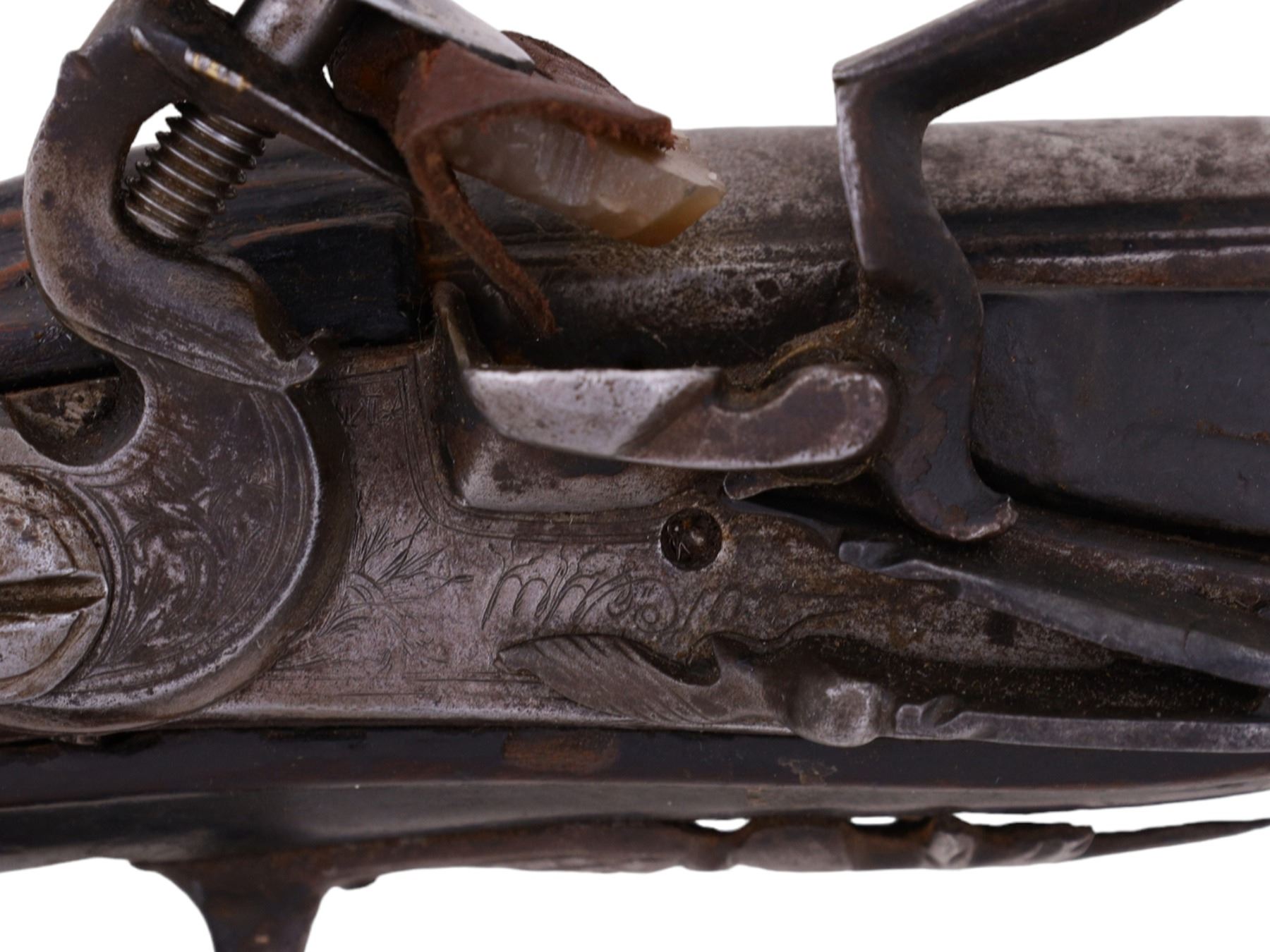 The hammer and the lockplate are engraved with filigree work and what appears to be a small inscription. The reverse of the lockplate has some remnants of its original silver damascene. The barrel of the gun also bears an inscription, and is held to the stock by a large, embossed silver barrel band.