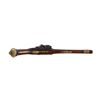 This Turkish flintlock pistol is likely from the first quarter of the 19th Century. It has been engraved with curving, flowing lines throughout the stock that sometimes create palm tree like shapes. The stock has been set with brass mounts, including a barrel band at the muzzle which has been decorated with pin-struck stamps, an inset medallion in the grip, a lightly engraved trigger guard, a rectangular tang, and a large round pommel shaped as a flower with repoussé petals, finished with a brass pommel cap with delicate engraving. The barrel and lockplate are both engraved, and the lock mechanism itself is in working order.