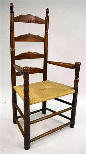 A TURNED MAPLE AND ASH LADDER BACK RUSH SEAT ARMCHAIR; American, some wear