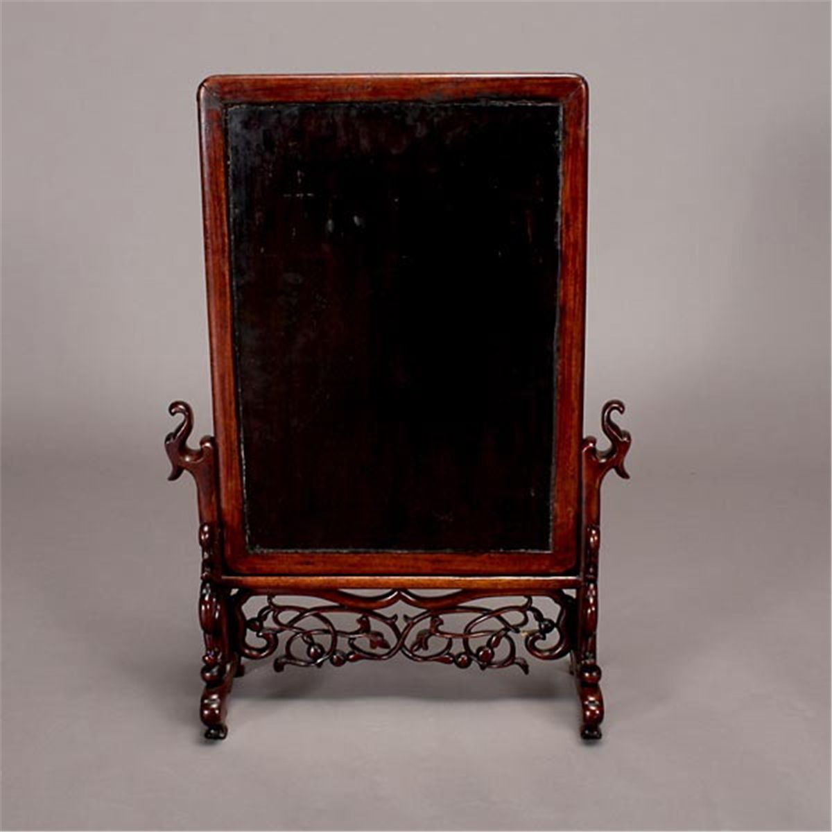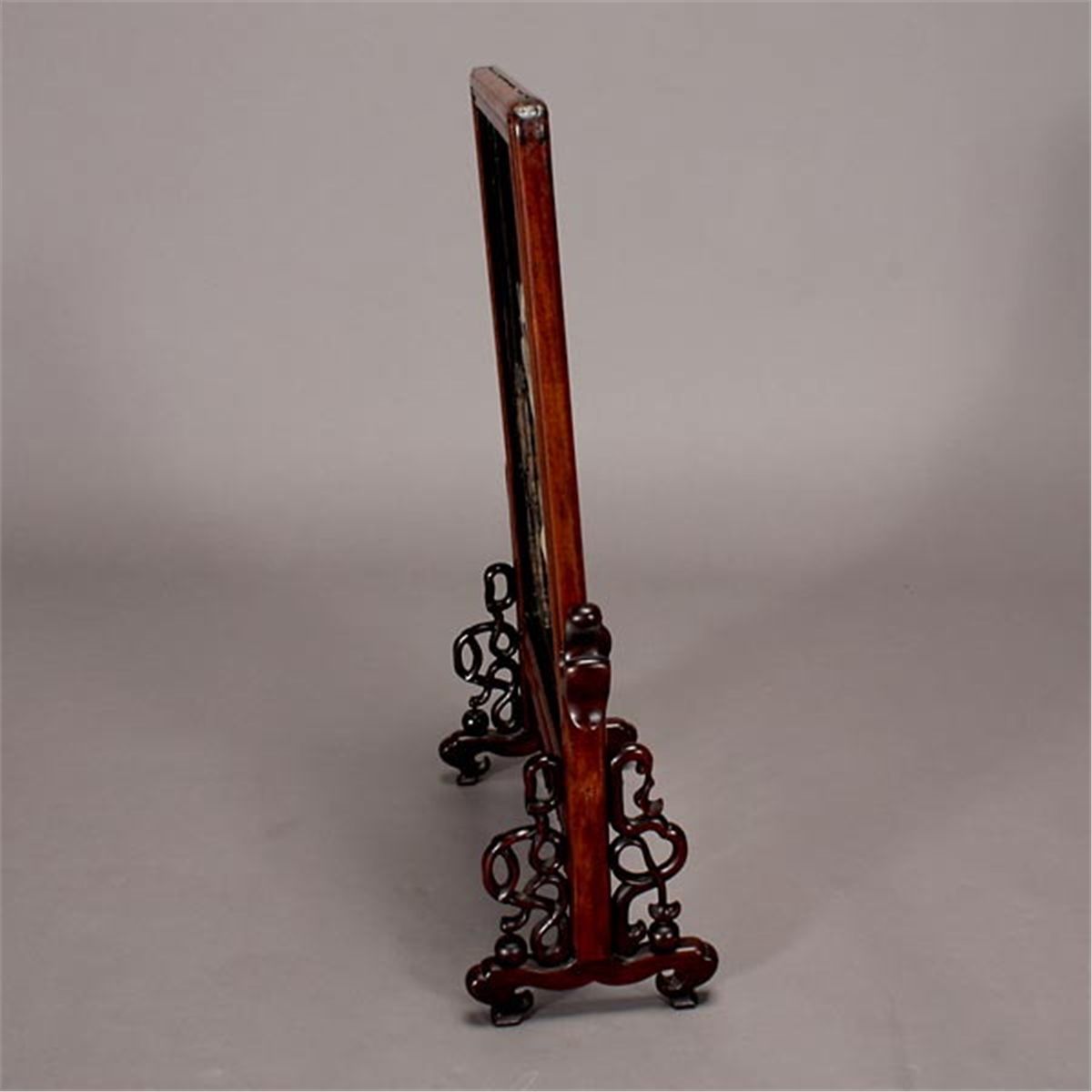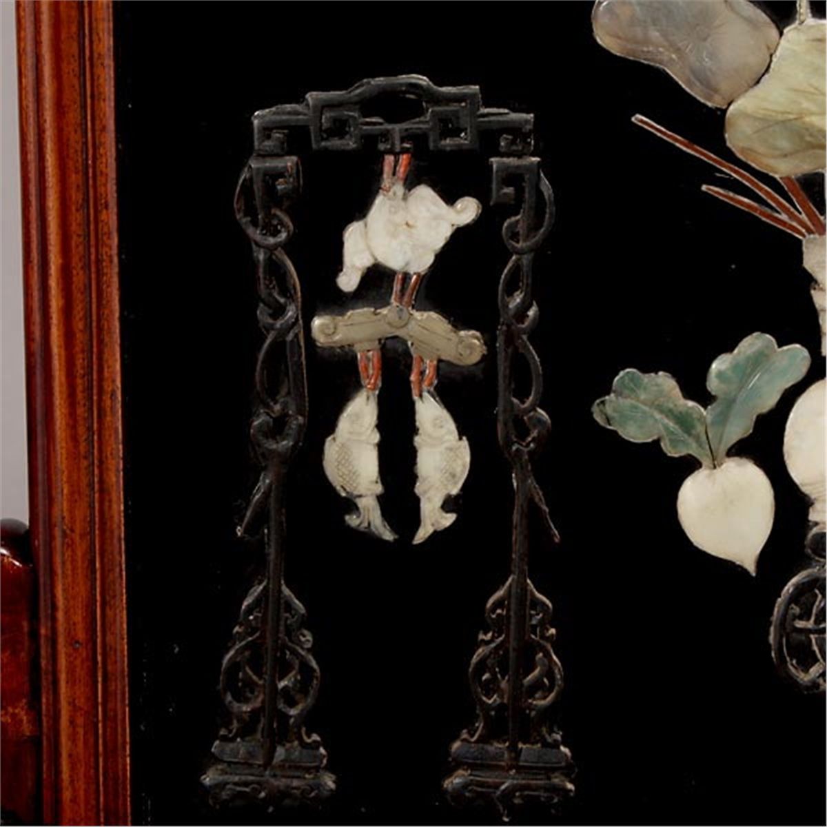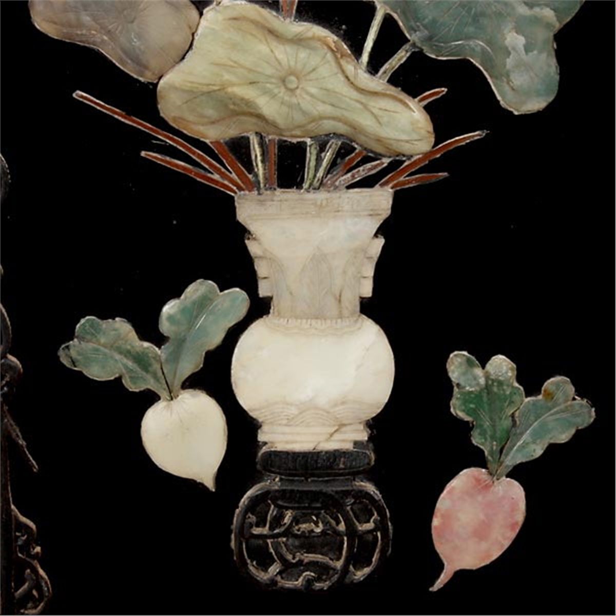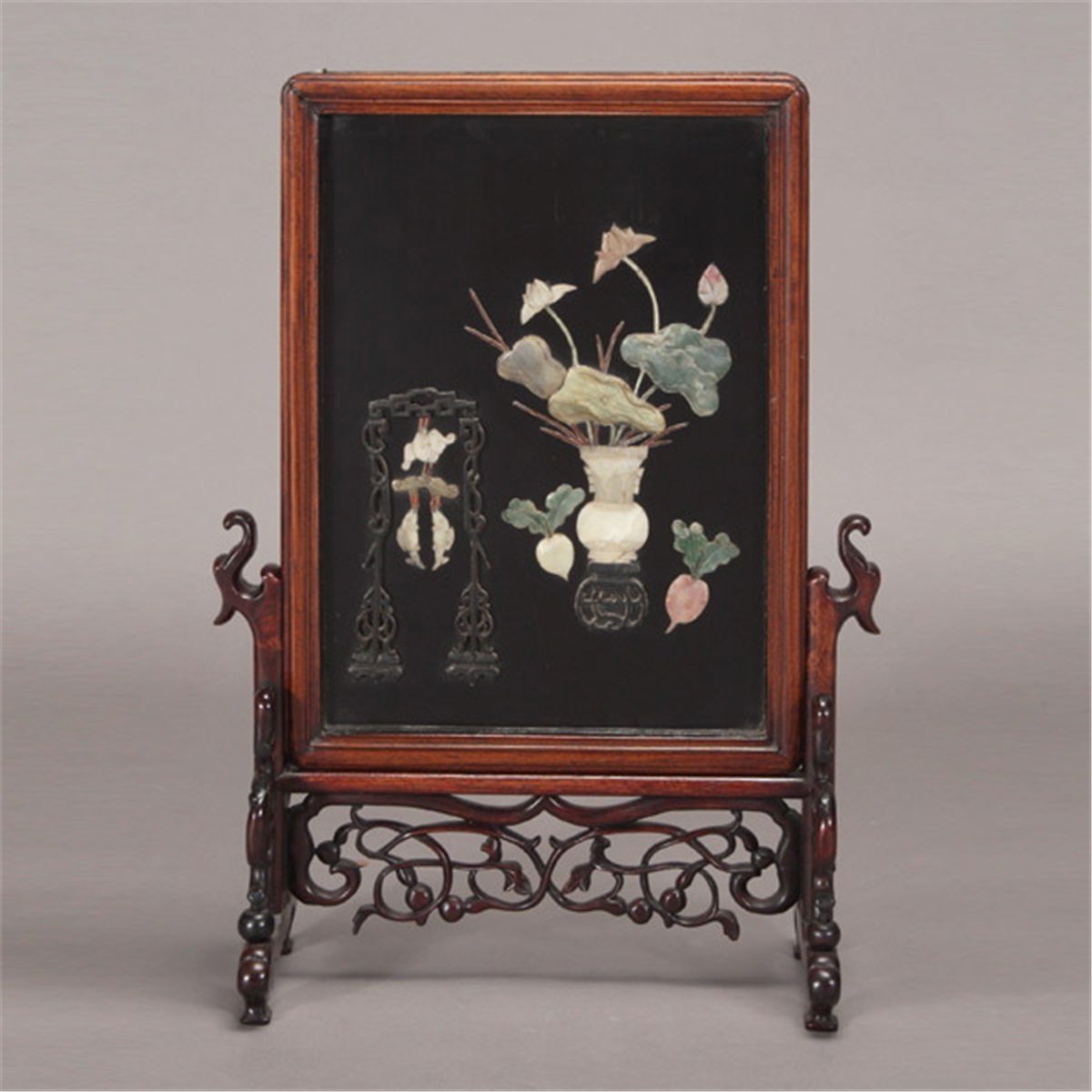A Table Screen with Stone Inlay, The panel inset inlaid in hardstone, bamboo, wood with antiquities, a vase with lotus leaves and flowers, along with two radishes, all reserved on a black lacquer ground, set within a hardwood frame with bead edges, with carved wood stand a glass cover. 19th Century, 20 3/4 x 15 1/4 inches (52.7 x 38.7 cm) [Cracks, detachments. This condition report states major condition issues only.]