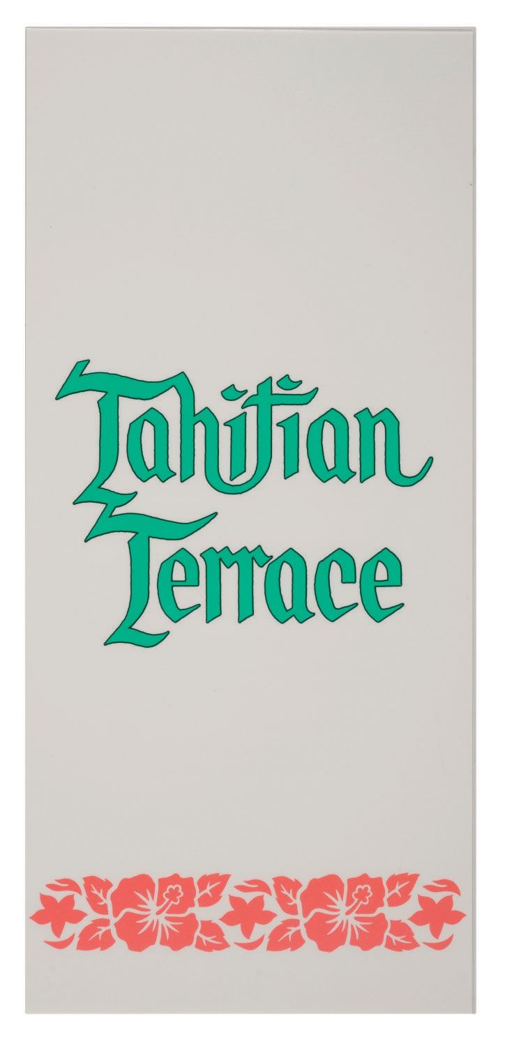 (Disneyland, 1980s) A Tahitian Terrace Appetizer Menu. Tahitian Terrace operated in Adventureland from 1962 to 1993. This menu dates from the mid-to-late 1980s and features four appetizers and a Polynesian hibiscus floral motif. Measuring 5"x11", the laminated menu is in fine condition with no apparent wear from use.