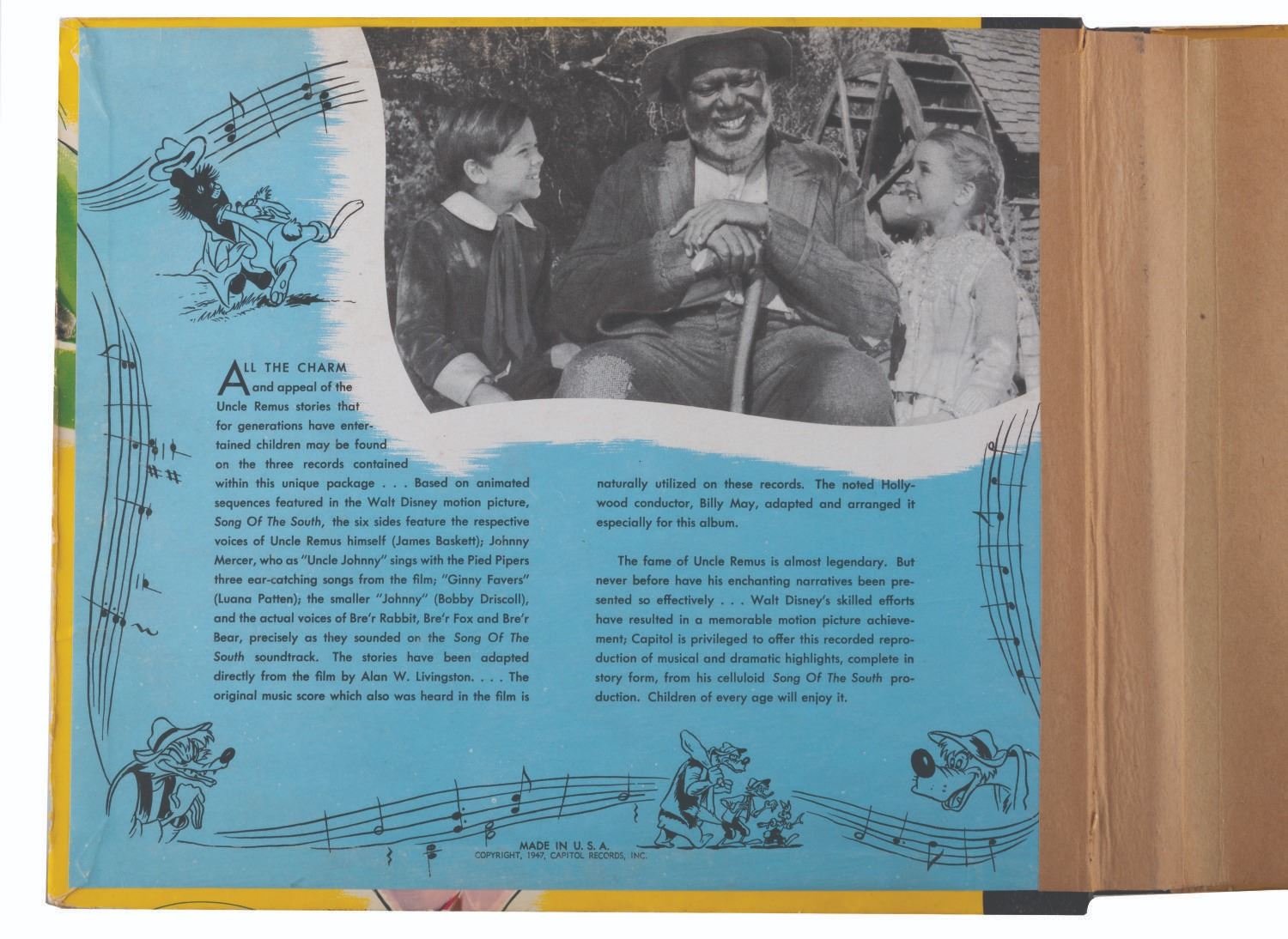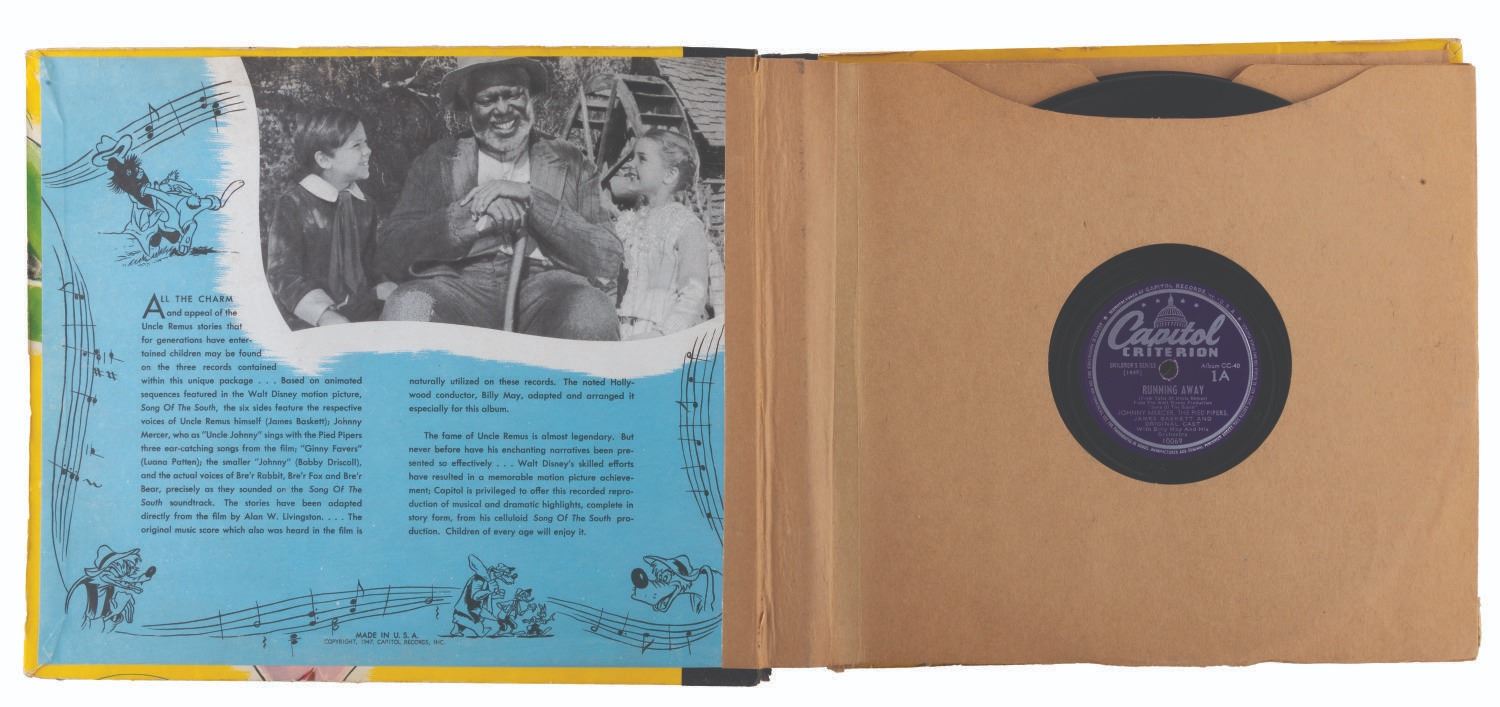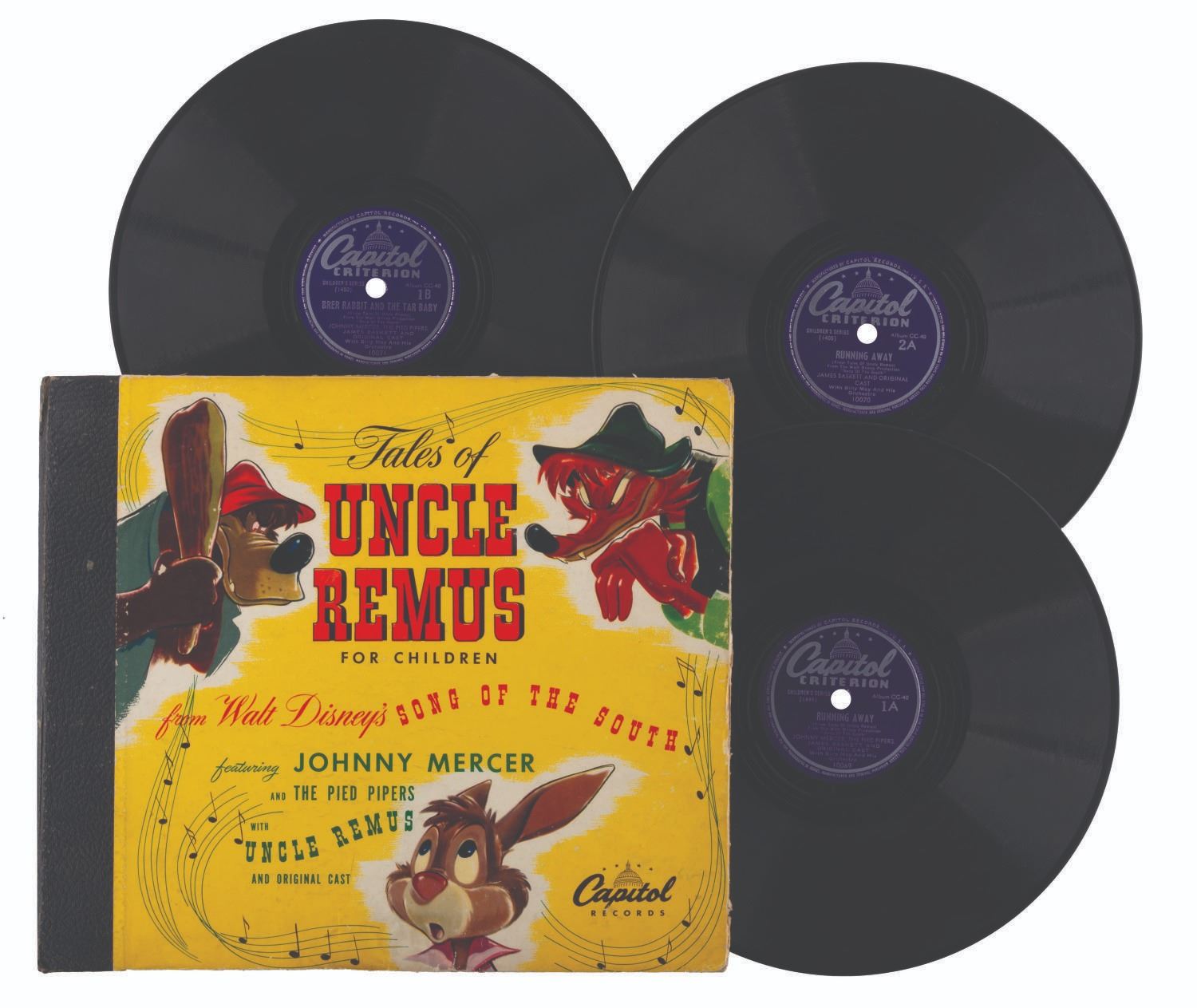 (Capitol Records, 1947) A “Tales of Uncle Remus from Walt Disney’s ‘Song of the South’” 78 RPM three record album featuring Johnny Mercer and the Pied Pipers. The album includes performances by Honorary Academy Award-winner James Baskett and the rest of the film’s cast. Measuring 10” in diameter, the shellac records are playable and in fair condition with heavy scratches, stains, and smudges, while the 10.5” x 12” album cover displays in good condition despite scratches and heavy wear, notably on the almost fully-separated spine.