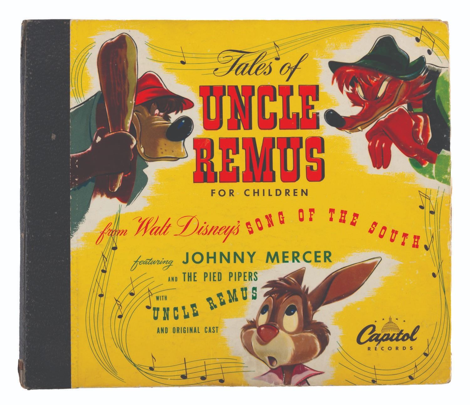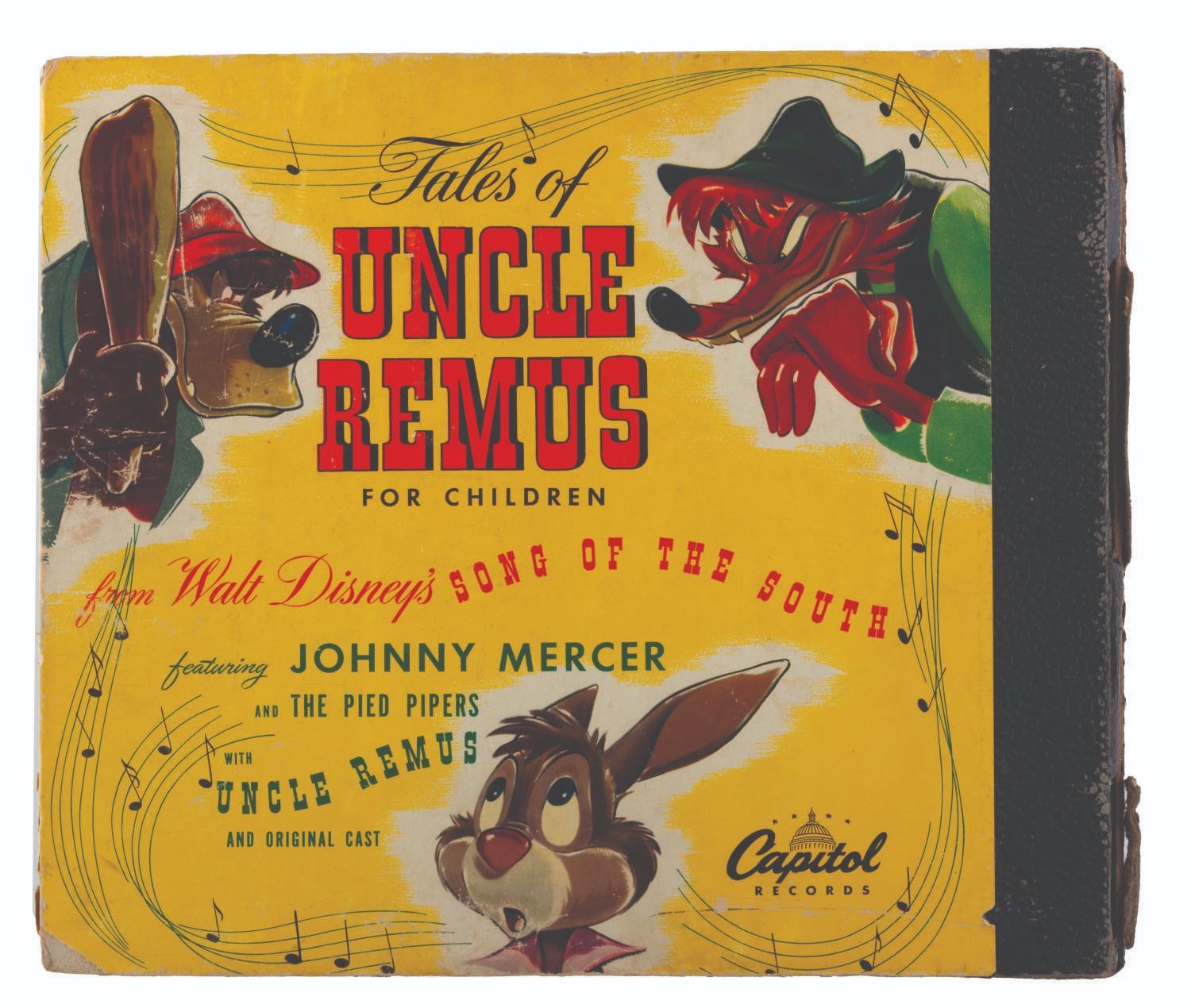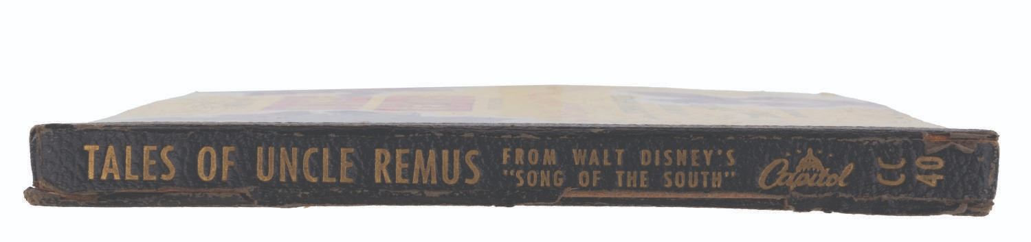 (Capitol Records, 1947) A “Tales of Uncle Remus from Walt Disney’s ‘Song of the South’” 78 RPM three record album featuring Johnny Mercer and the Pied Pipers. The album includes performances by Honorary Academy Award-winner James Baskett and the rest of the film’s cast. Measuring 10” in diameter, the shellac records are playable and in fair condition with heavy scratches, stains, and smudges, while the 10.5” x 12” album cover displays in good condition despite scratches and heavy wear, notably on the almost fully-separated spine.