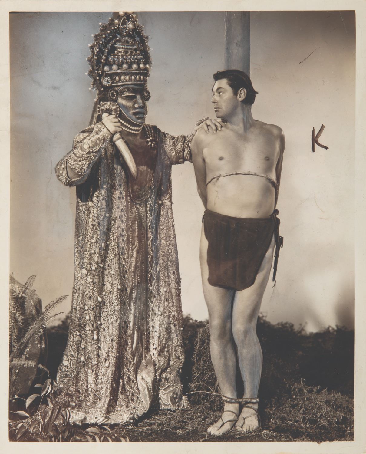 (RKO, 1948) A publicity photo for “Tarzan and the Mermaids” featuring Tarzan (Johnny Weissmuller) trapped by the film’s villain, Palanth (George Zucco). The photo has been touched up with paint, a common practice during this era. Measuring 8” x 10”, the photo is in good condition with edge wear, creasing, a 2.25” fold to the upper right corner, notations, and a newspaper clipping of the photo adhered to the reverse.