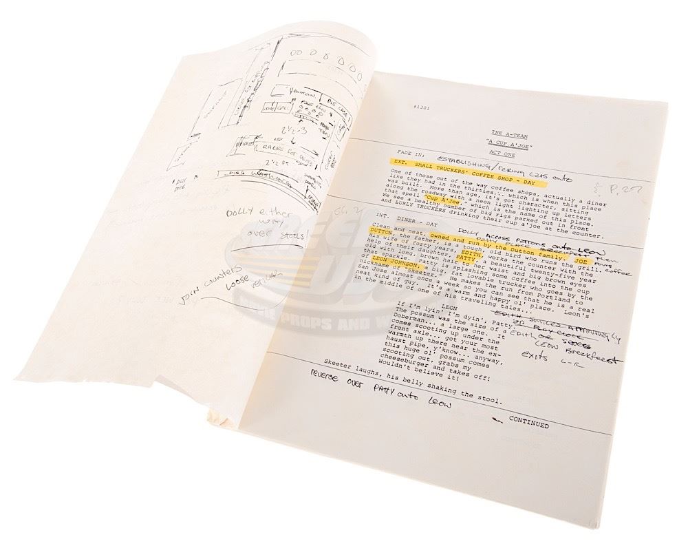 (NBC, 1983-1987) This very special script is titled "Cup A' Joe" and is dated 7/16/84 and is the personal shooting script of director, Craig R. Baxley. The 62 page script features all white pages and has many pages of Craig's handwritten notes and several hand drawn scene layout sketches. As expected, wear from use is present.