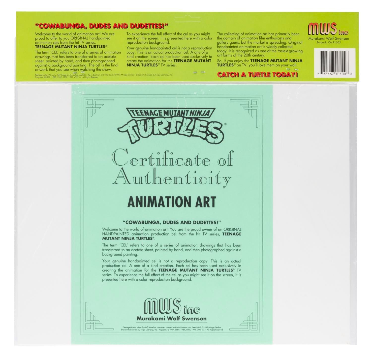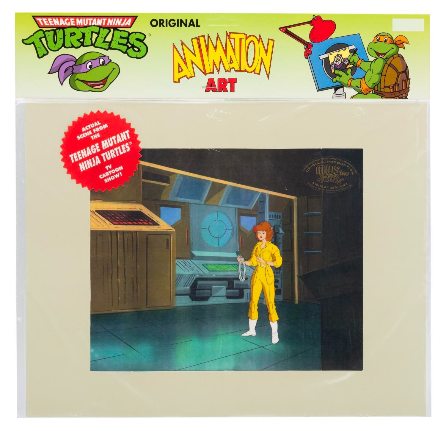 (Murakami-Wolf-Swenson, 1987-91) An original production cel of April O’Neil from"Teenage Mutant Ninja Turtles" with a color copy background. April has an image size of 1.75" x 4.25" in an 11" x 14" matte. The cel is sealed in its original bag and is in very good to fine condition with typical light wear from production use.