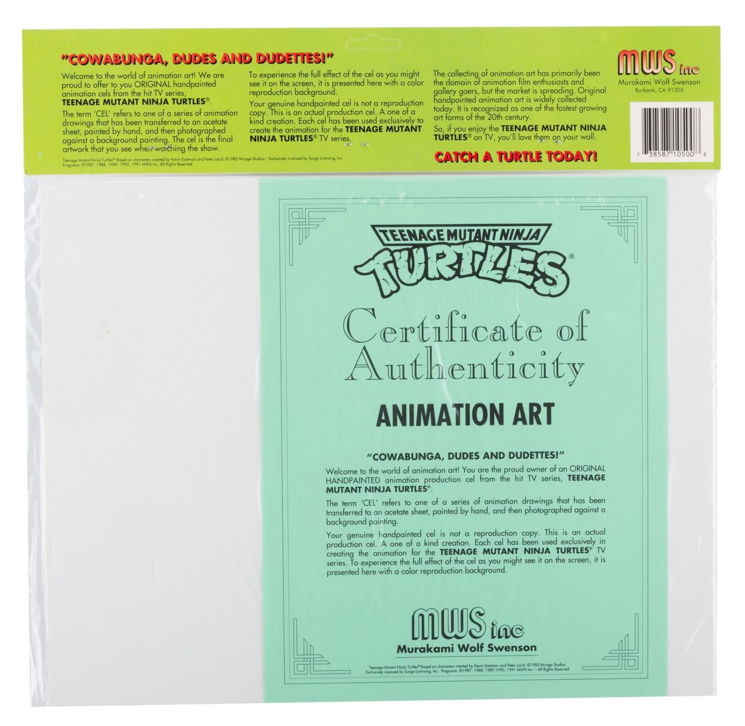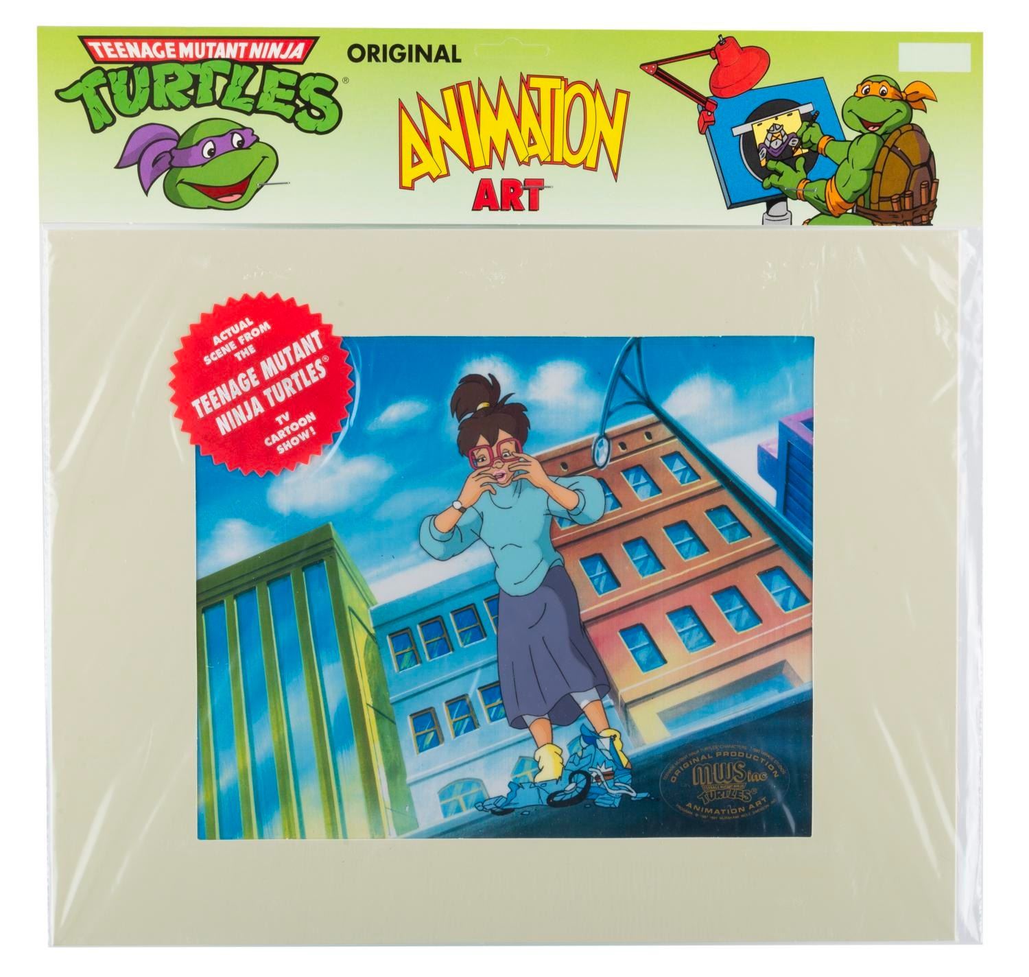 (Murakami-Wolf-Swenson, 1987-91) An original production cel of Irma from"Teenage Mutant Ninja Turtles" with a color copy background. Irma has an image size of 3" x 6.5" in an 11" x 14" matte. The cel is sealed in its original bag and is in fine condition.
