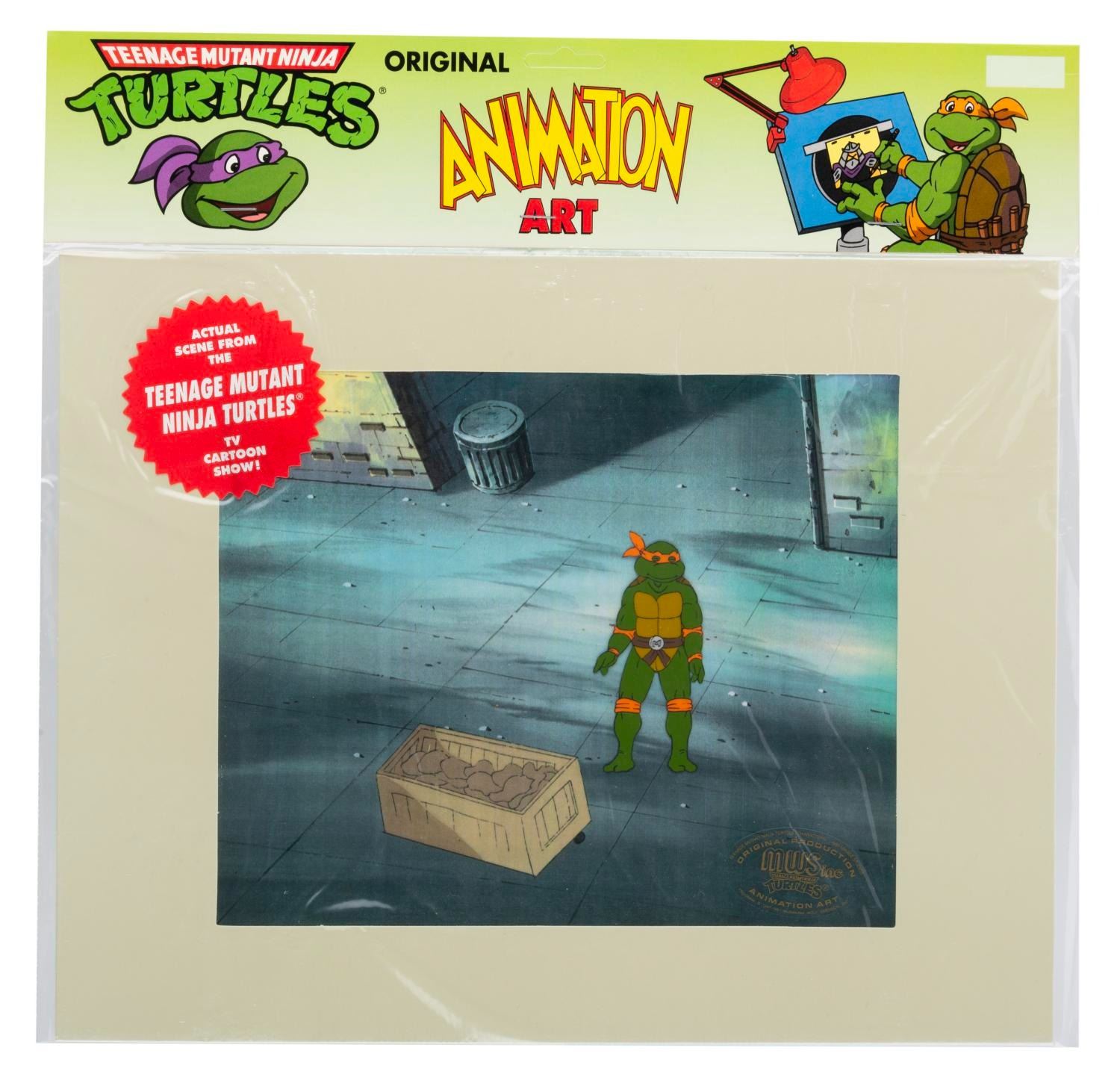 (Murakami-Wolf-Swenson, 1987-91) An original production cel of Michelangelo from"Teenage Mutant Ninja Turtles" with a color copy background. Michelangelo has an image size of 1.5" x 3.5" in an 11" x 14" matte. The cel is sealed in its original bag and is in fine condition.