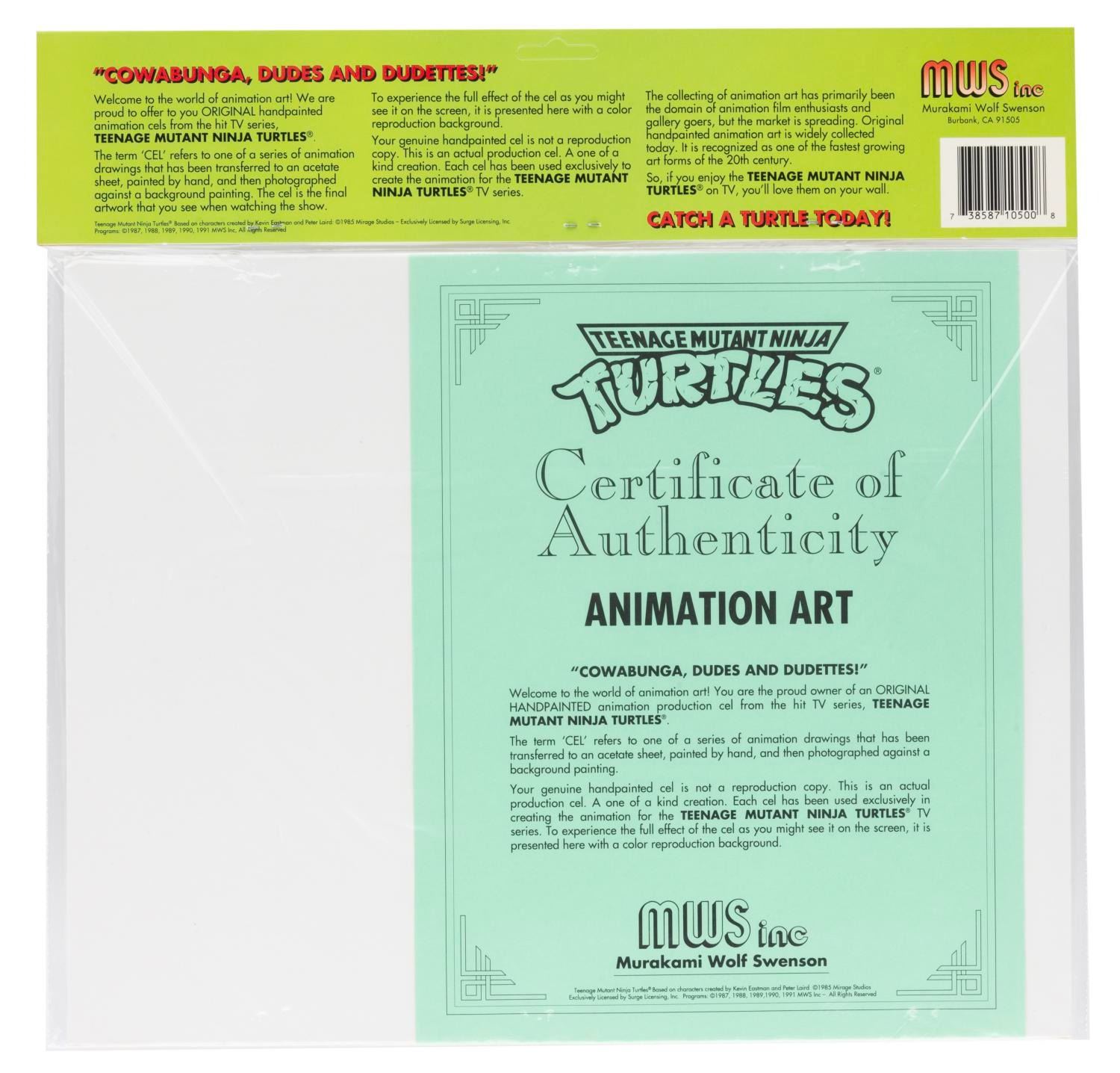(Murakami-Wolf-Swenson, 1987-91) An original production cel of Raphael taking out the trash from"Teenage Mutant Ninja Turtles" with a color copy background. Raphael and the trash have an image size of 3.25" x 3.37" in an 11" x 14" matte. The cel is sealed in its original bag and is in very good to fine condition with typical light wear from production use.