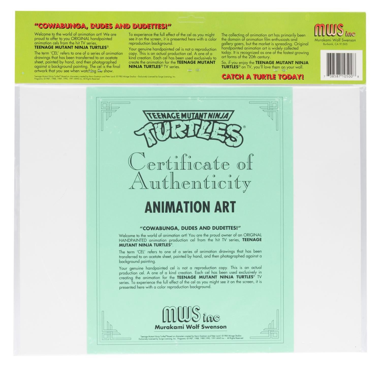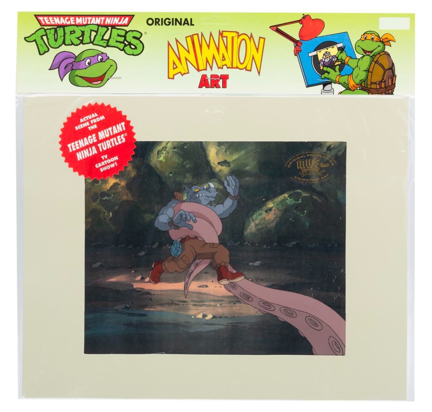 (Murakami-Wolf-Swenson, 1987-91) An original production cel of Rocksteady in the clutches of a tentacle from"Teenage Mutant Ninja Turtles" with a color copy background. Rocksteady and the tentacle have an image size of 6.5" x 7.25" in an 11" x 14" matte. The cel is sealed in its original bag and is in fine condition.