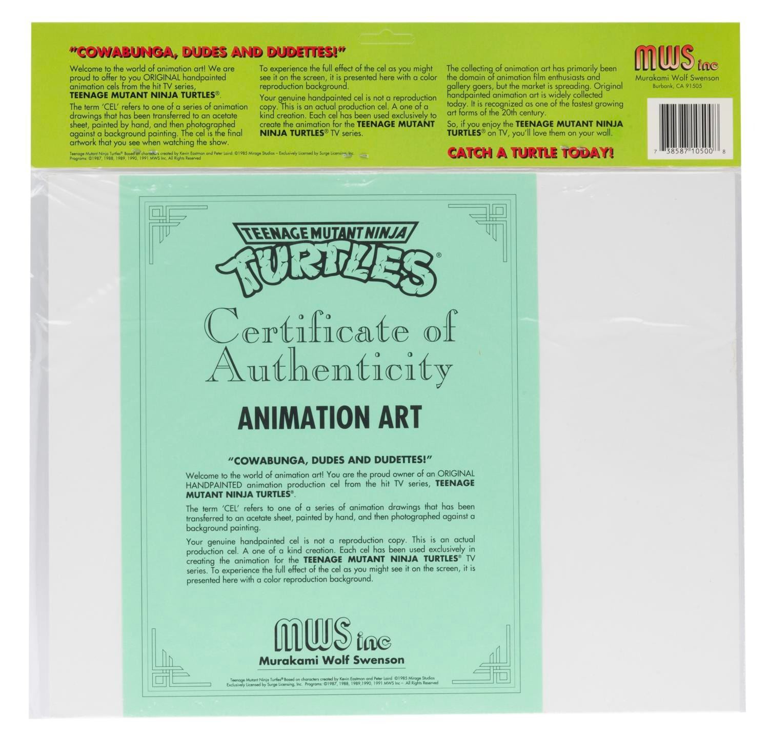 (Murakami-Wolf-Swenson, 1987-91) An original production cel of Splinter from"Teenage Mutant Ninja Turtles" with a color copy background. Splinter has an image size of 2" x 2.5" in an 11" x 14" matte. The cel is sealed in its original bag and is in fine condition.