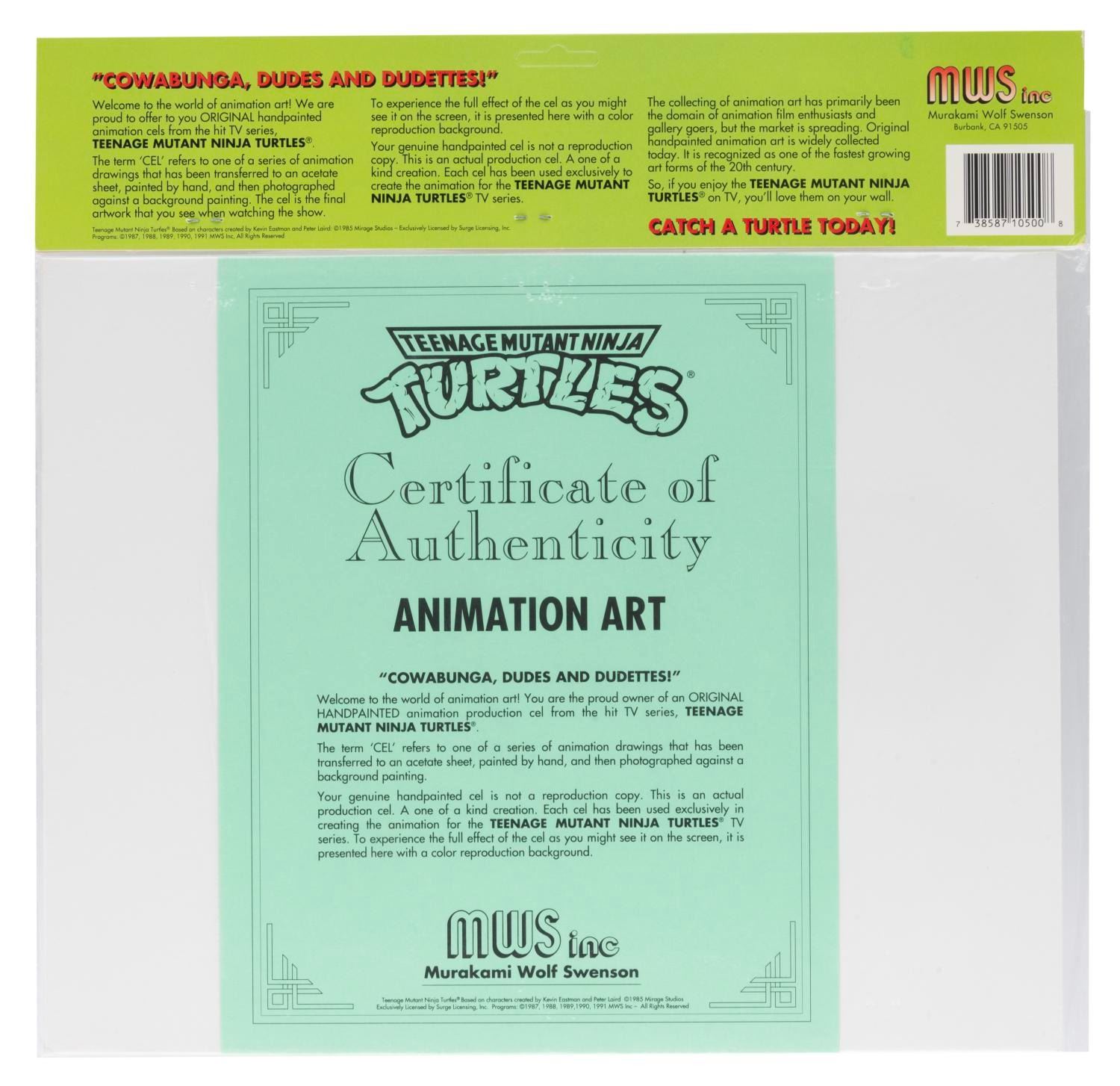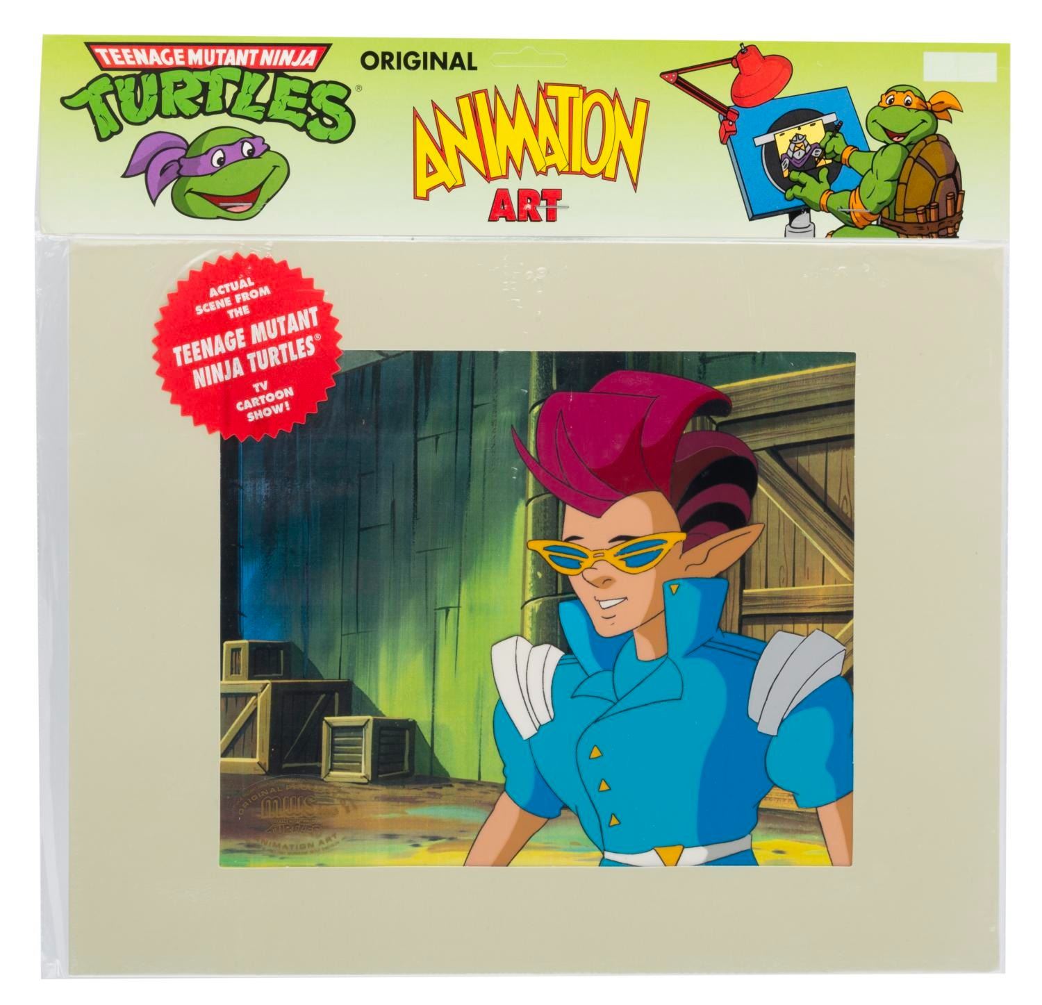(Murakami-Wolf-Swenson, 1987-91) An original production cel of Zak from"Teenage Mutant Ninja Turtles" with a color copy background. Zak has an image size of 6" x 7.75" in an 11" x 14" matte. The cel is sealed in its original bag and is in very good to fine condition with typical light wear from production use.